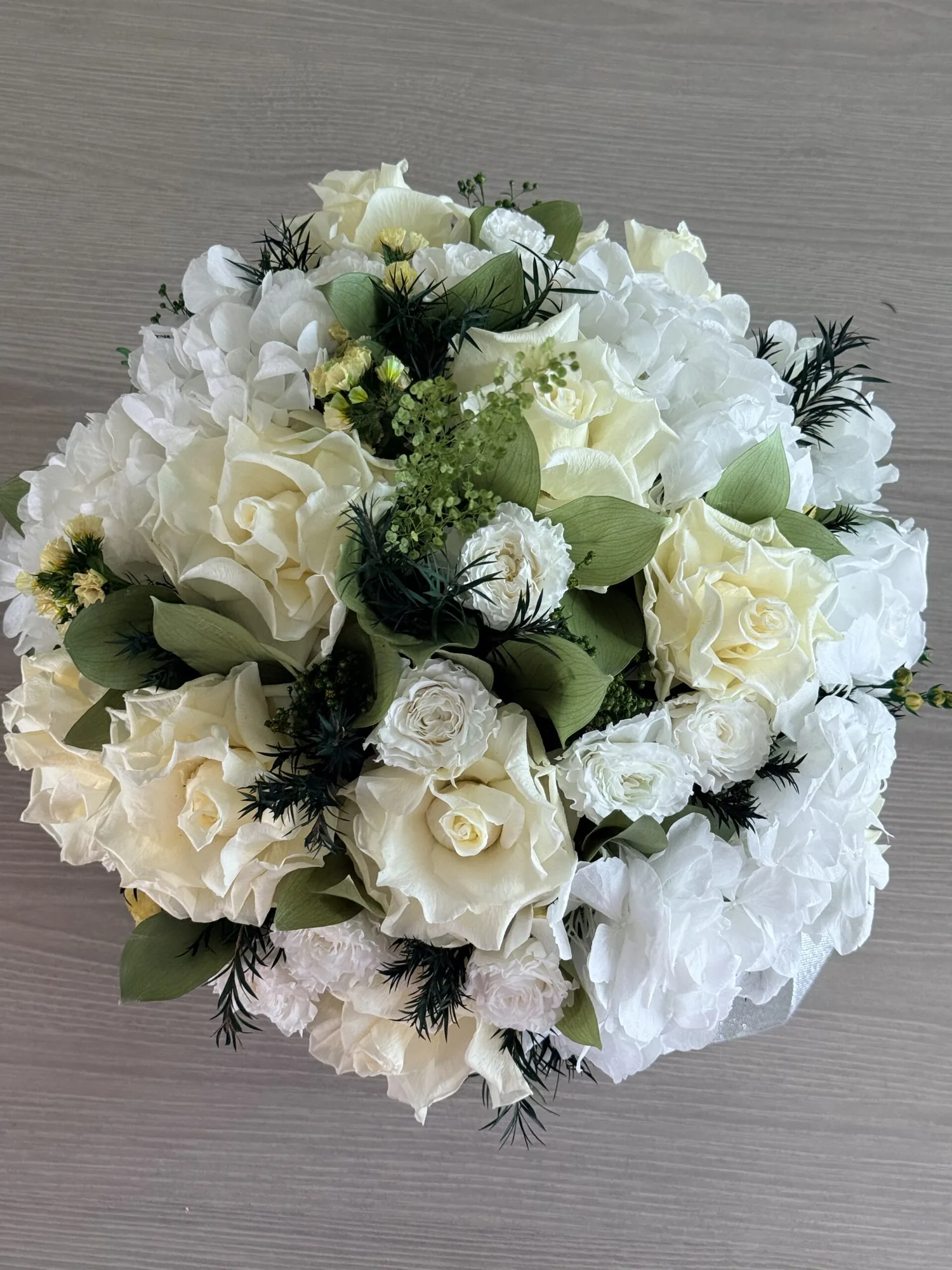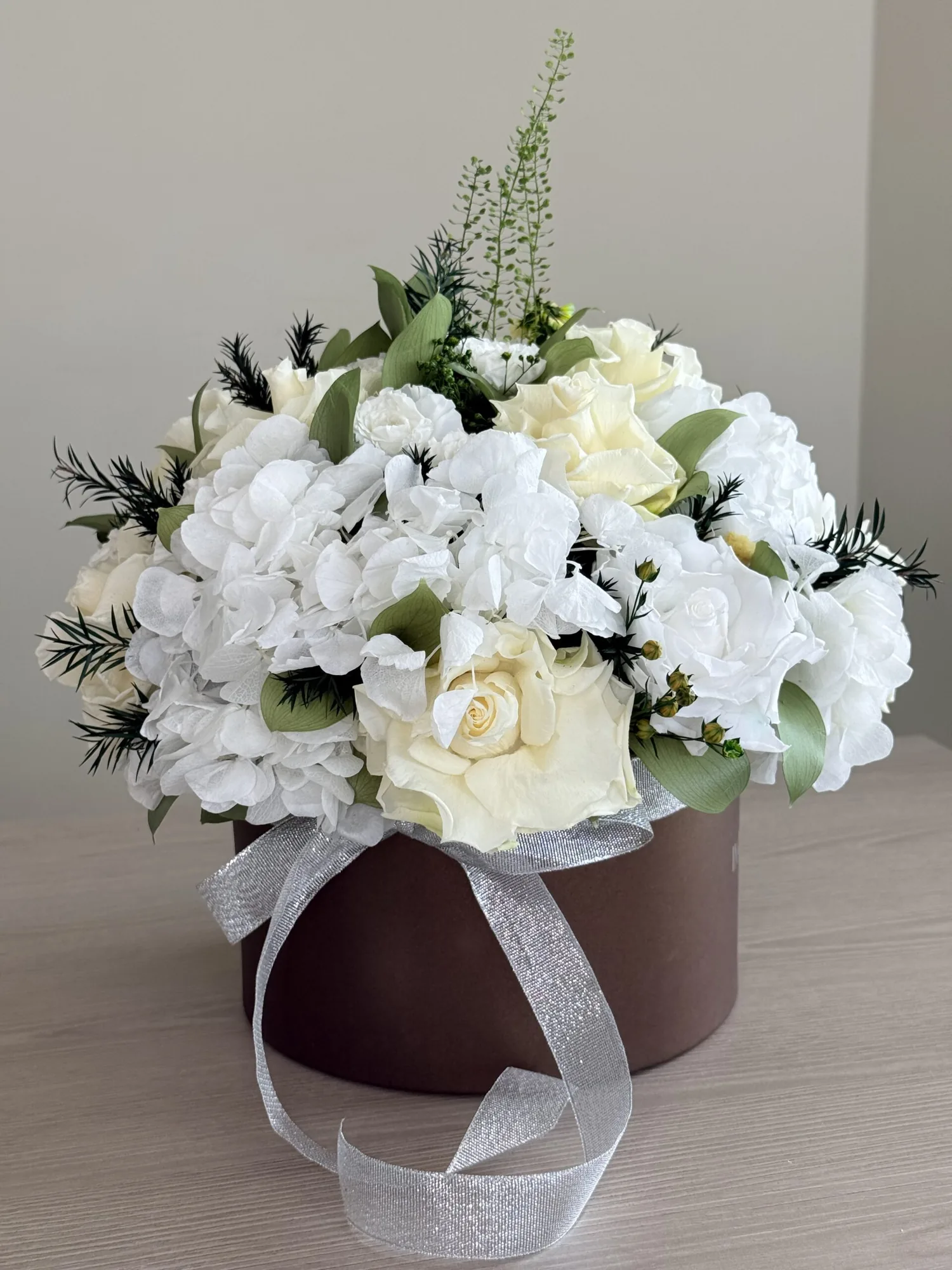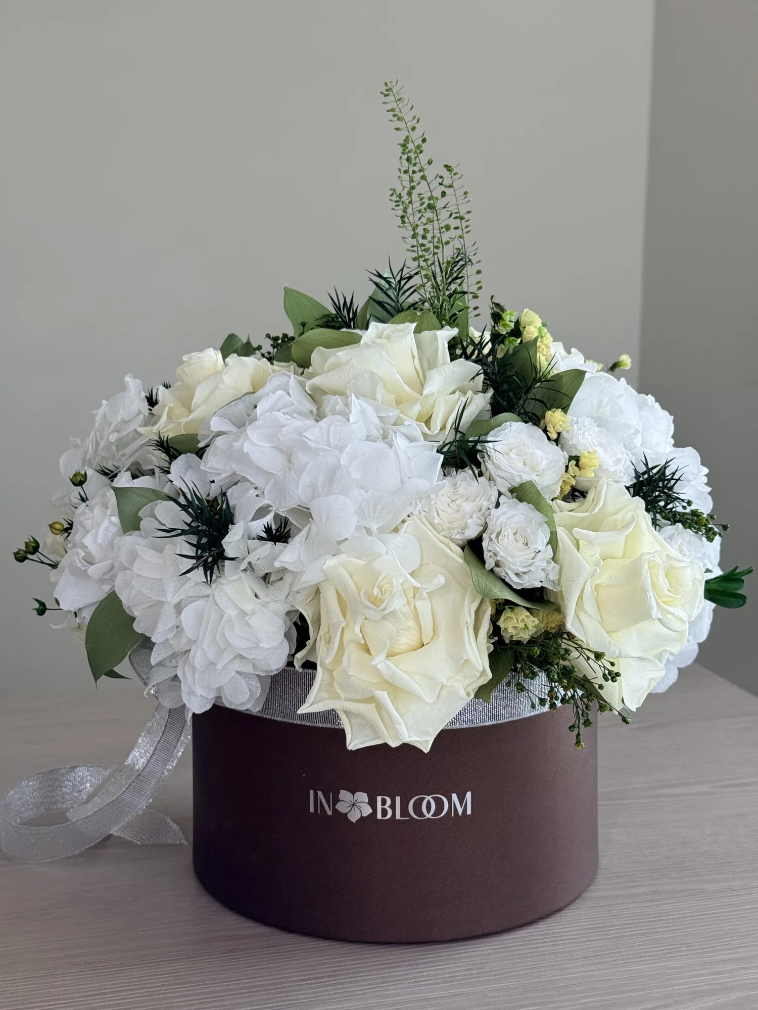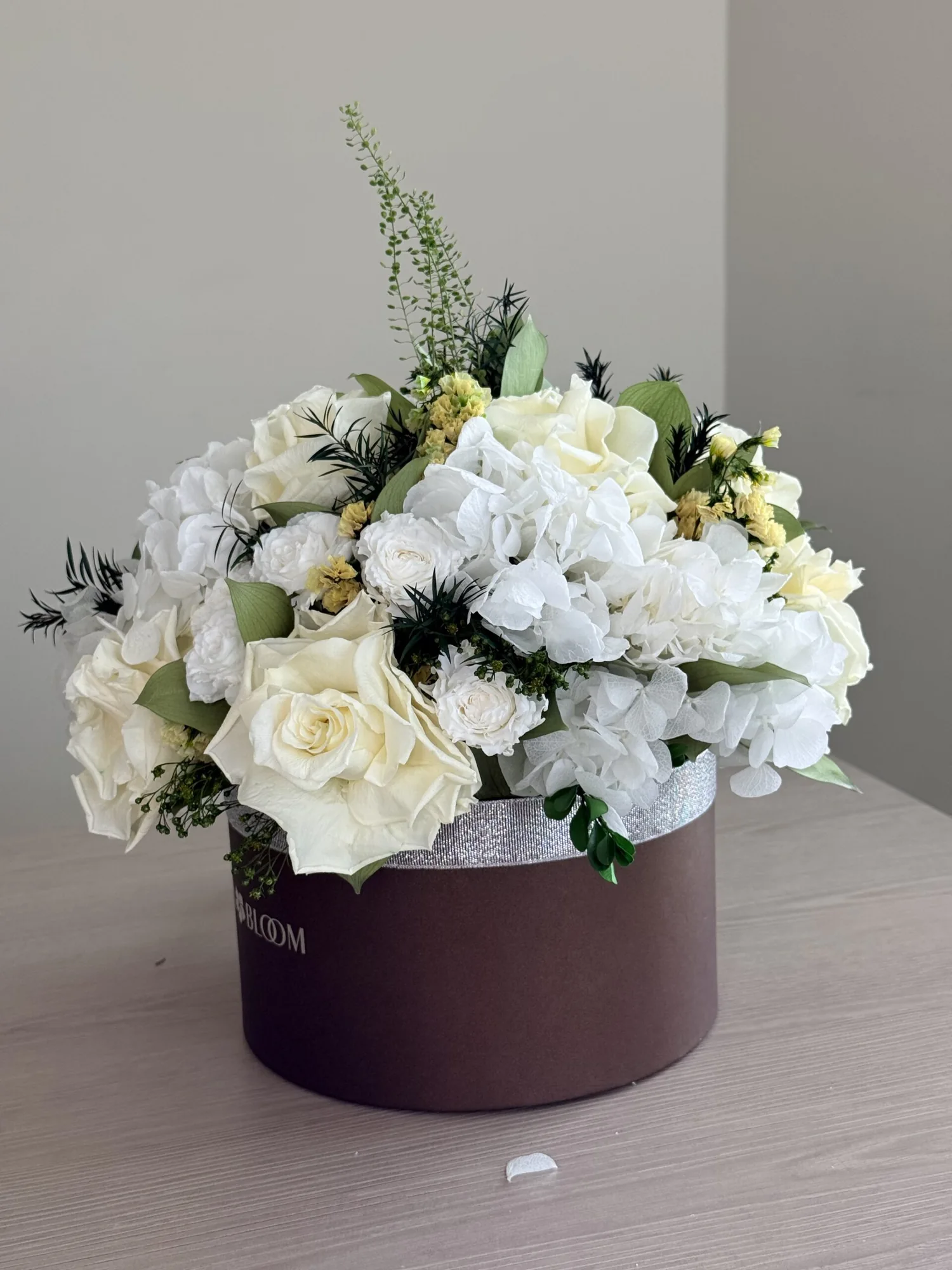 | Flower TypeExplore Our Premium Floral Selection The Flower Type attribute allows you to browse our exquisite collection based on the specific flowers used in each arrangement. From timeless roses and elegant orchids to lush peonies and vibrant dahlias, our curated selection ensures you find the perfect blooms for any occasion. Each flower type is carefully chosen for its beauty, longevity, and sophistication, offering both fresh and bio-preserved options. Whether you\'re looking for classic bouquets, statement floral pieces, or sustainable arrangements, our diverse range of flowers guarantees elegance that lasts. Find the perfect floral arrangement tailored to your taste and style. | Hydrangeas, Roses |