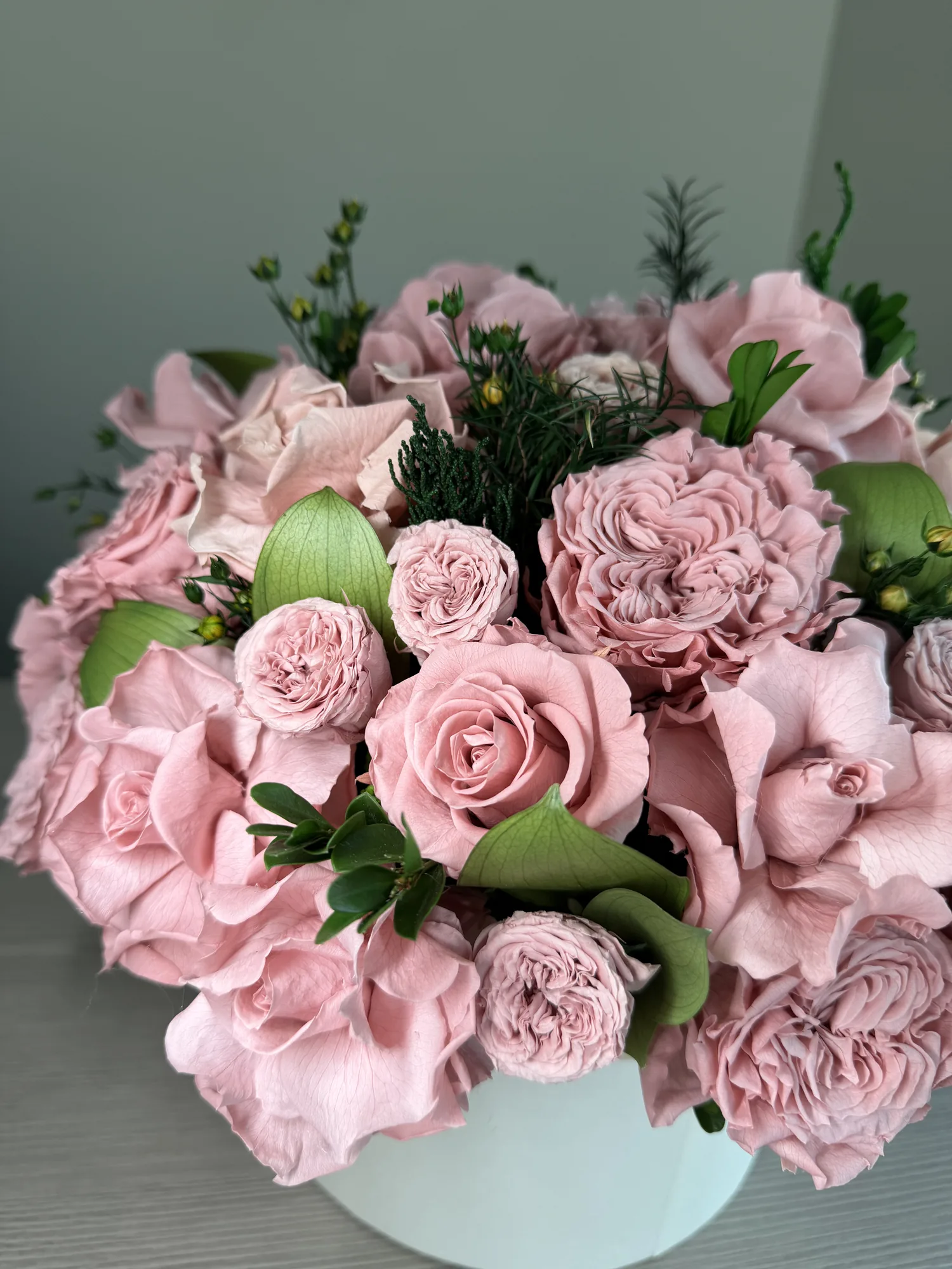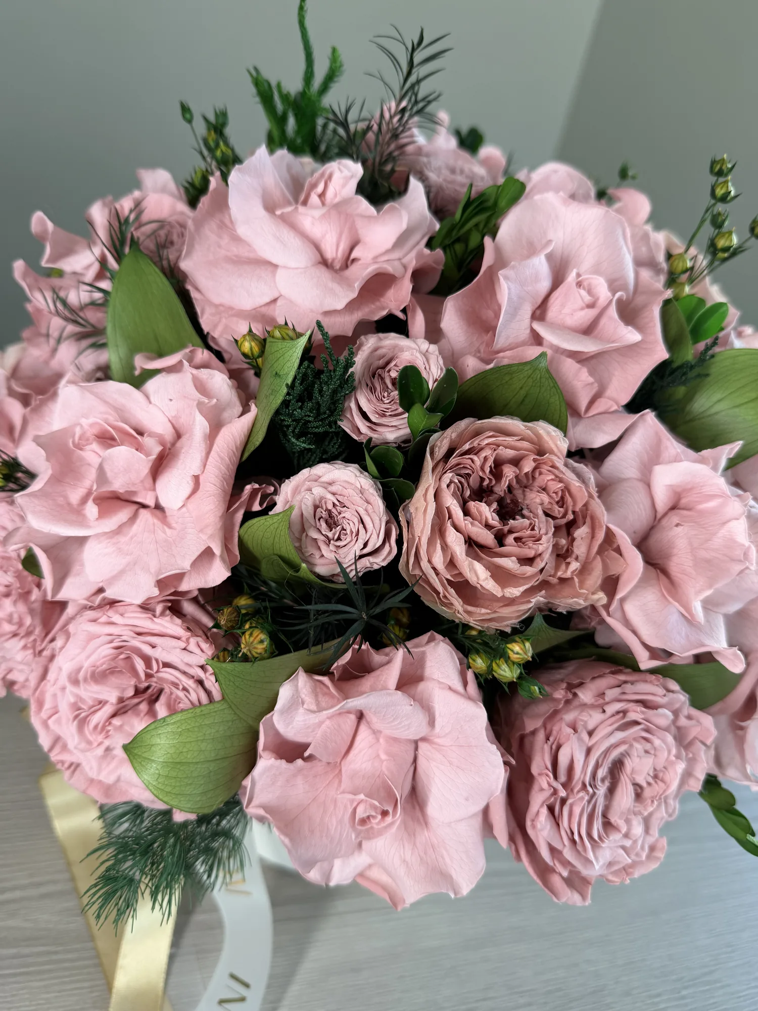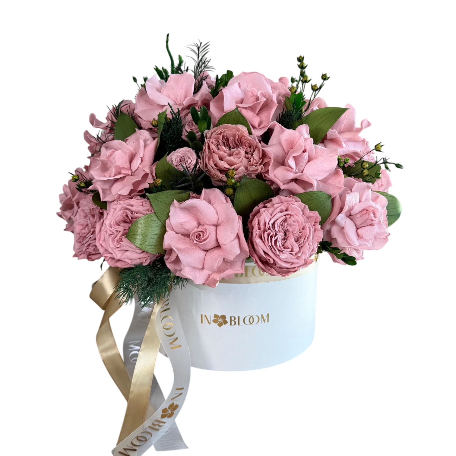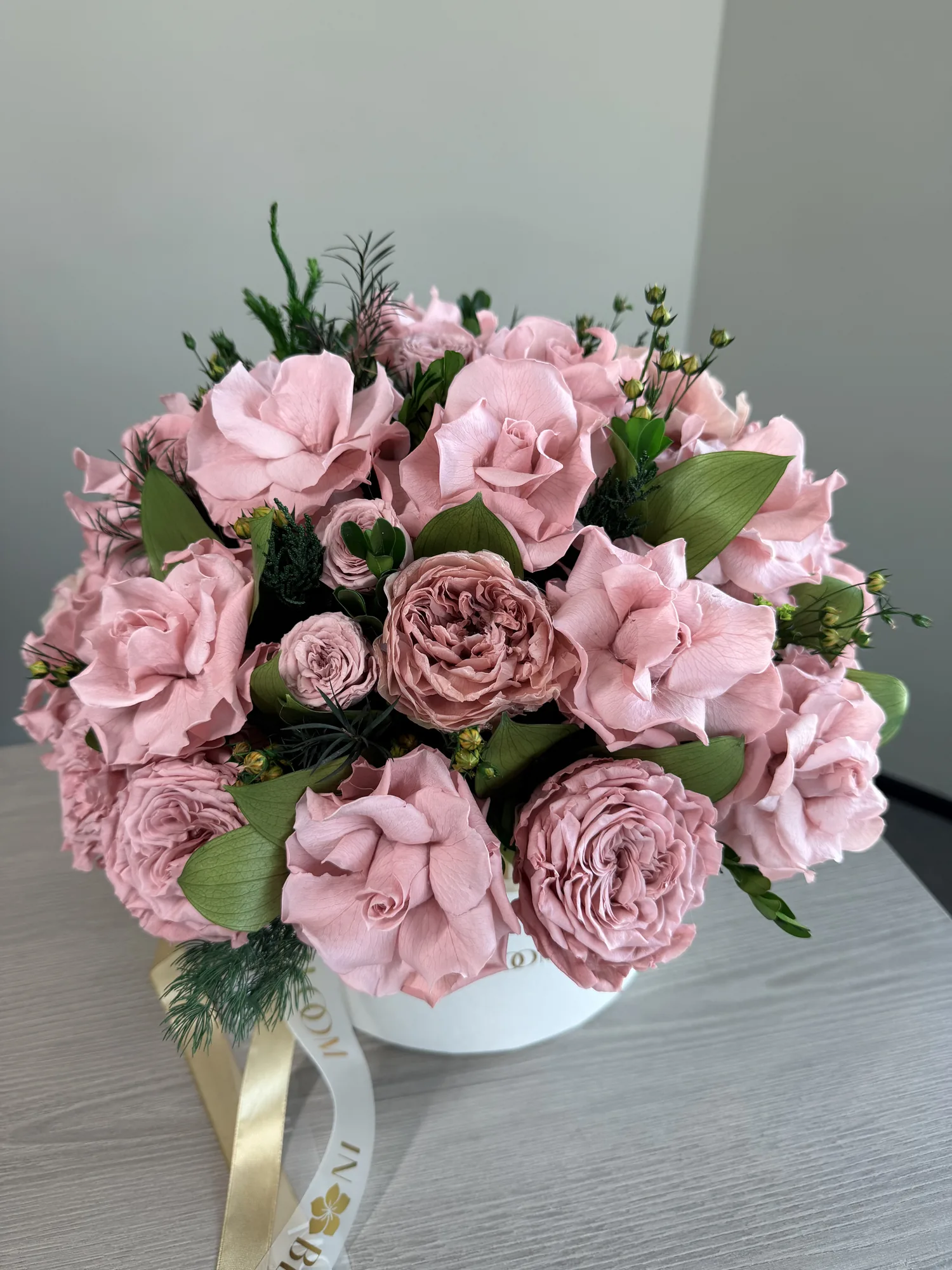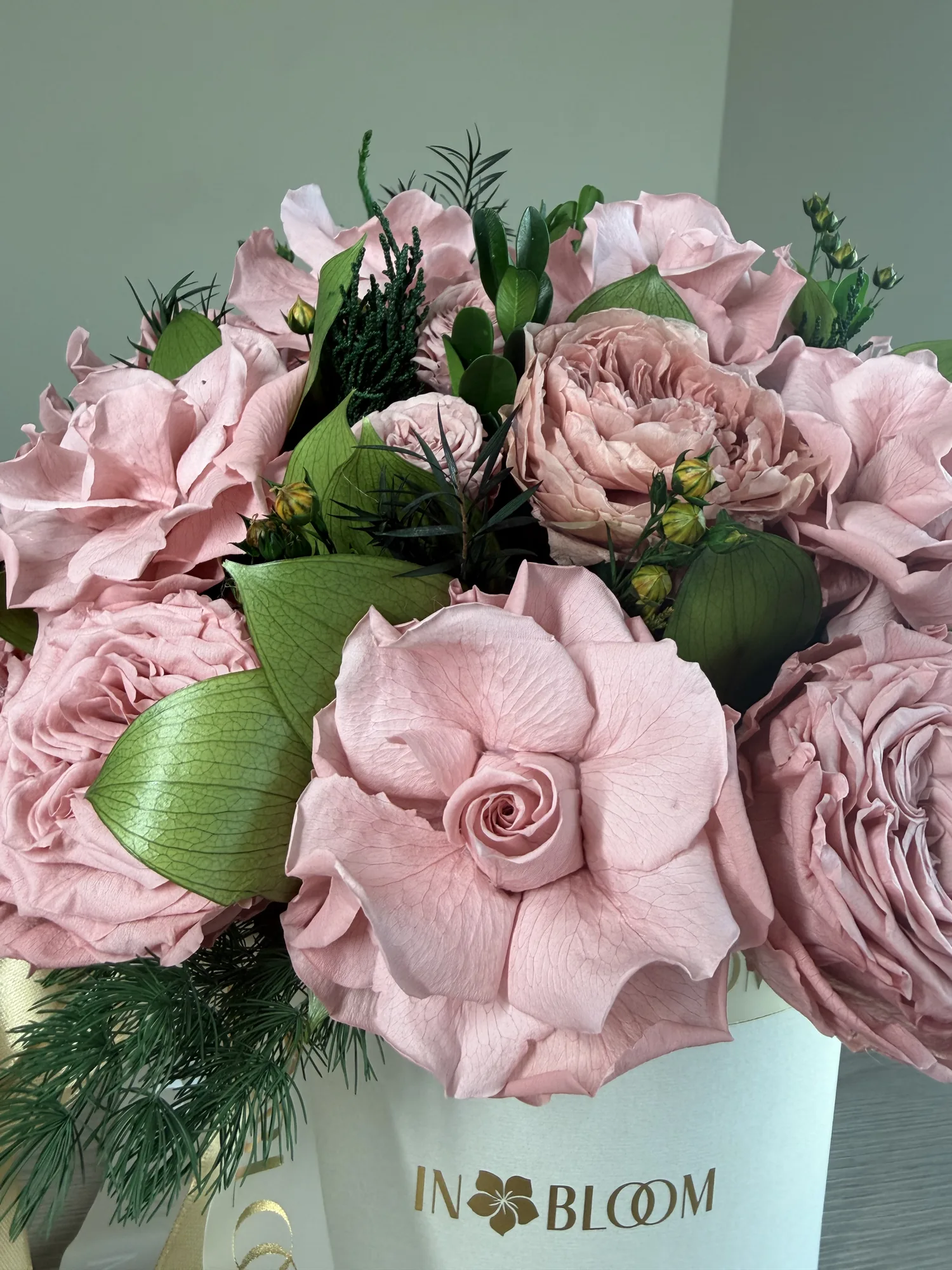 Olivia is big flower box of long-lasting blooms featuring delicate dusty pink & French and garden roses with green orange leaves and accented with dried flax.