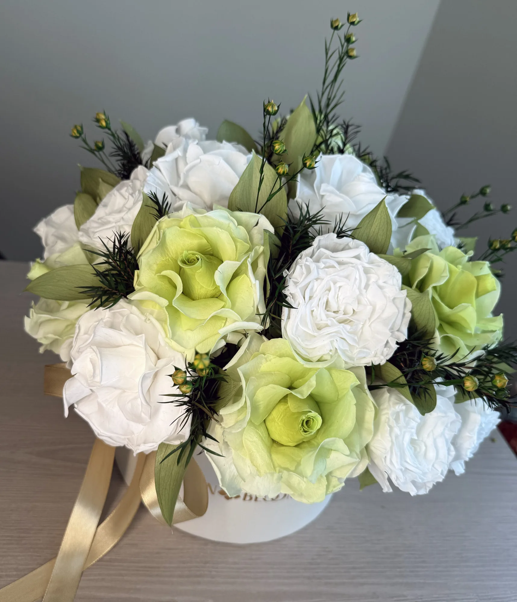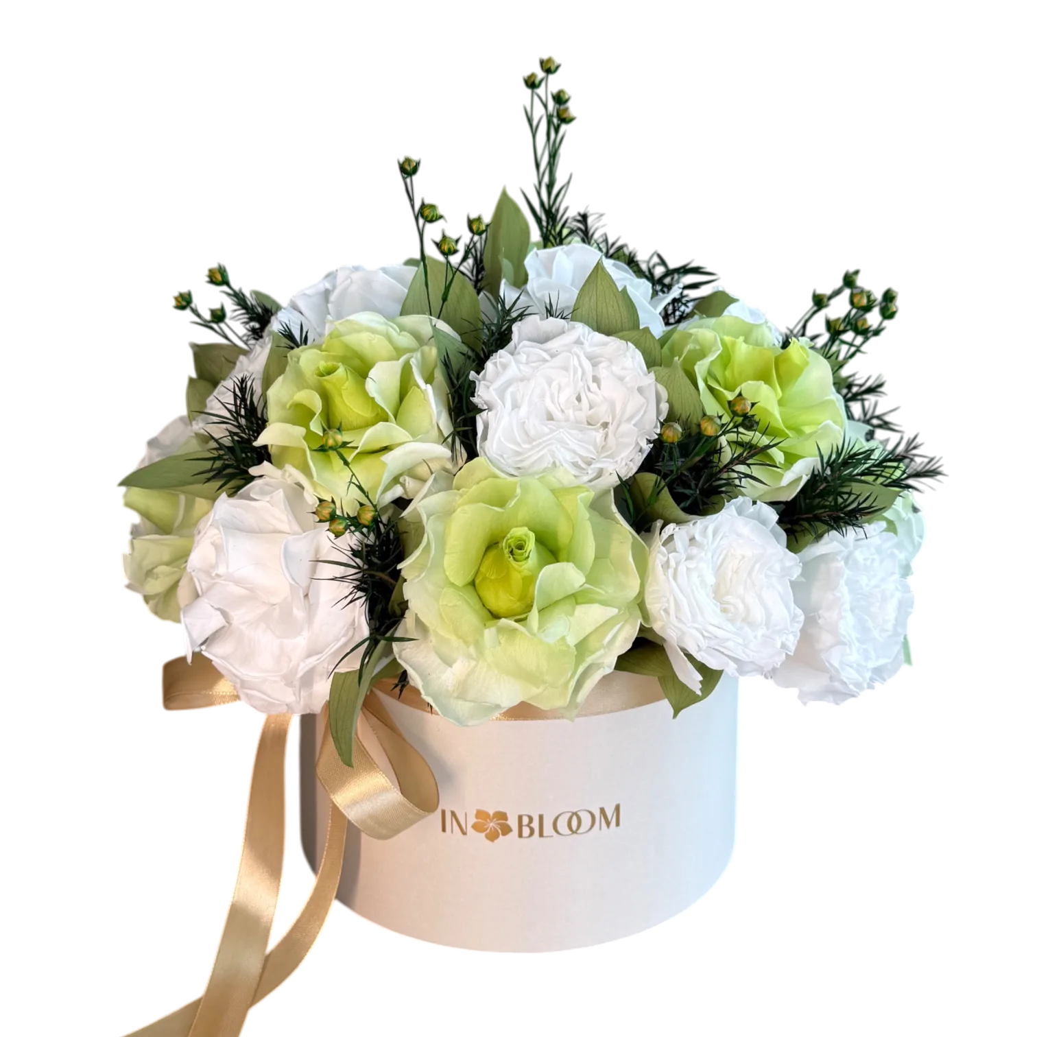 Olivia – Green & White is a long-lasting preserved flower gift box for Dubai celebrations, romantic gifting and premium home display, designed to stay elegant for over a year without water or daily care.