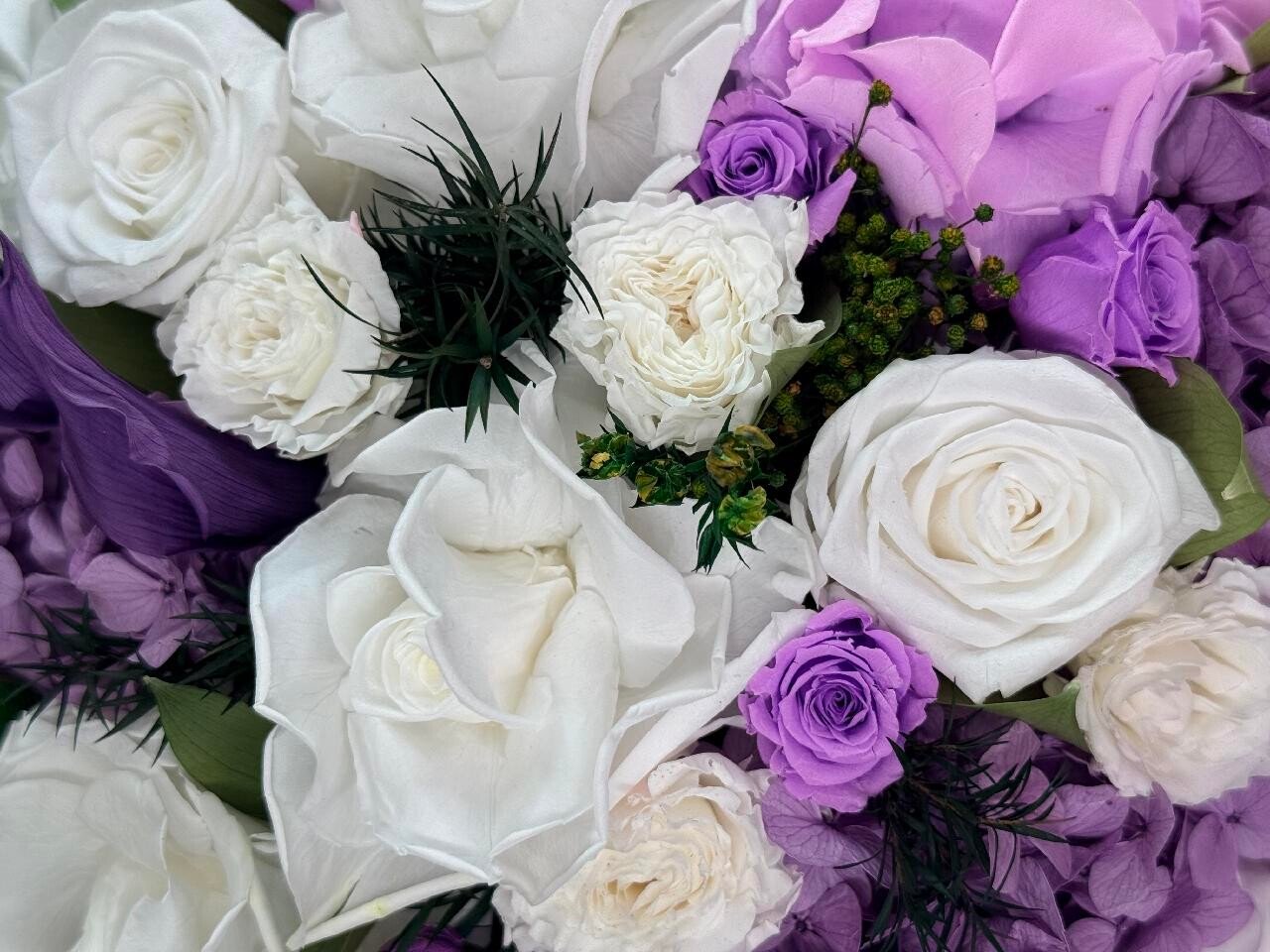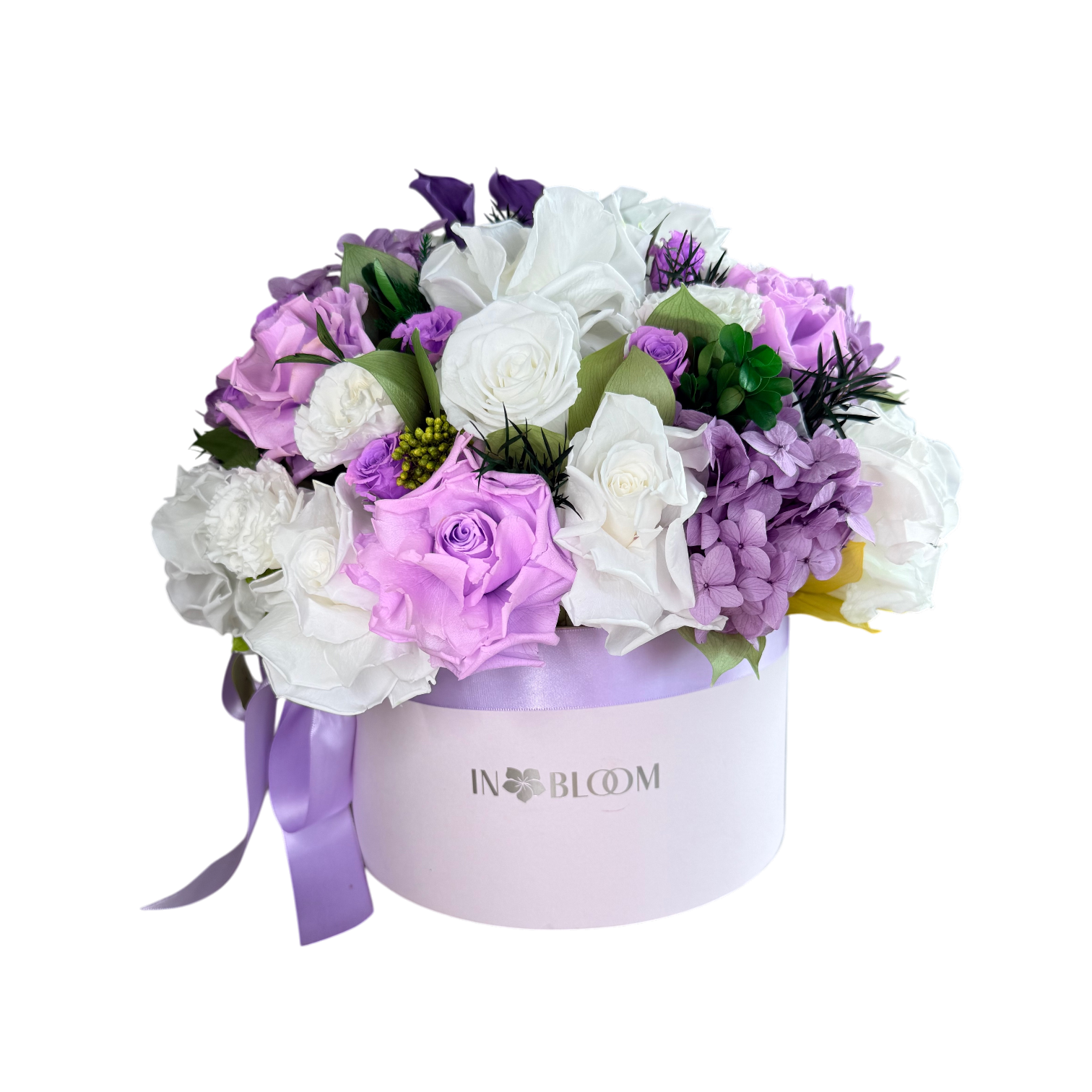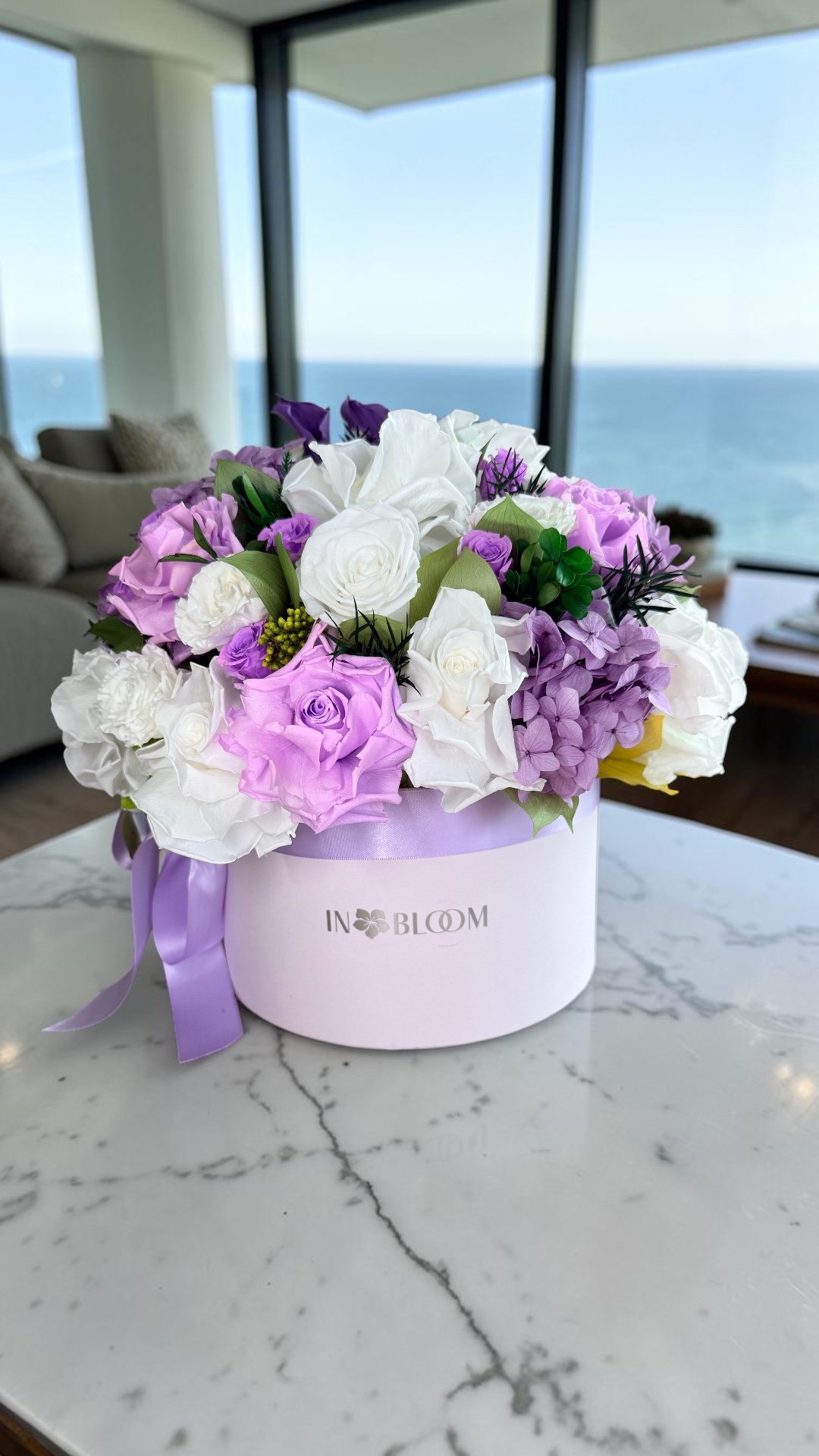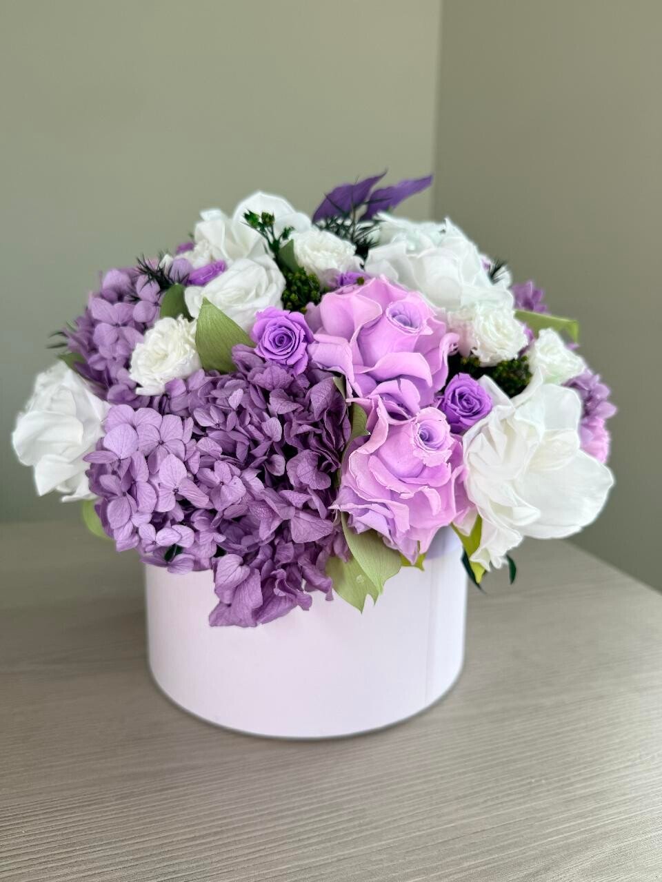 Olivia is big flower box of long-lasting blooms featuring delicate light purple & white French roses with green orange leaves and accented with dried flax.