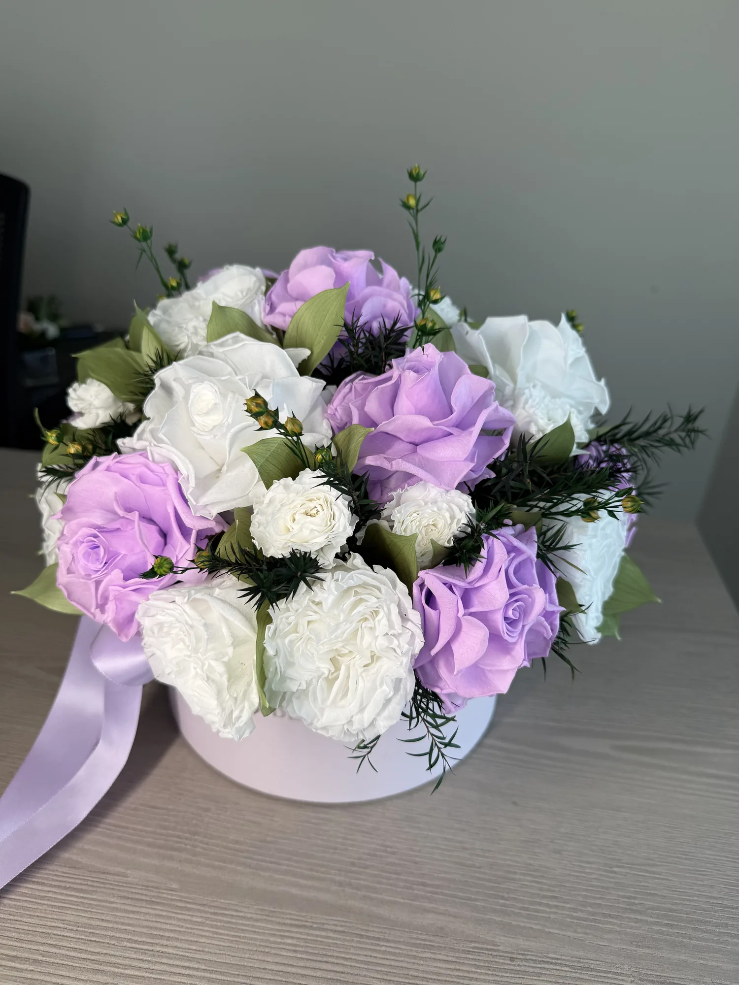 Olivia is big flower box of long-lasting blooms featuring delicate light purple & white French roses with green orange leaves and accented with dried flax.