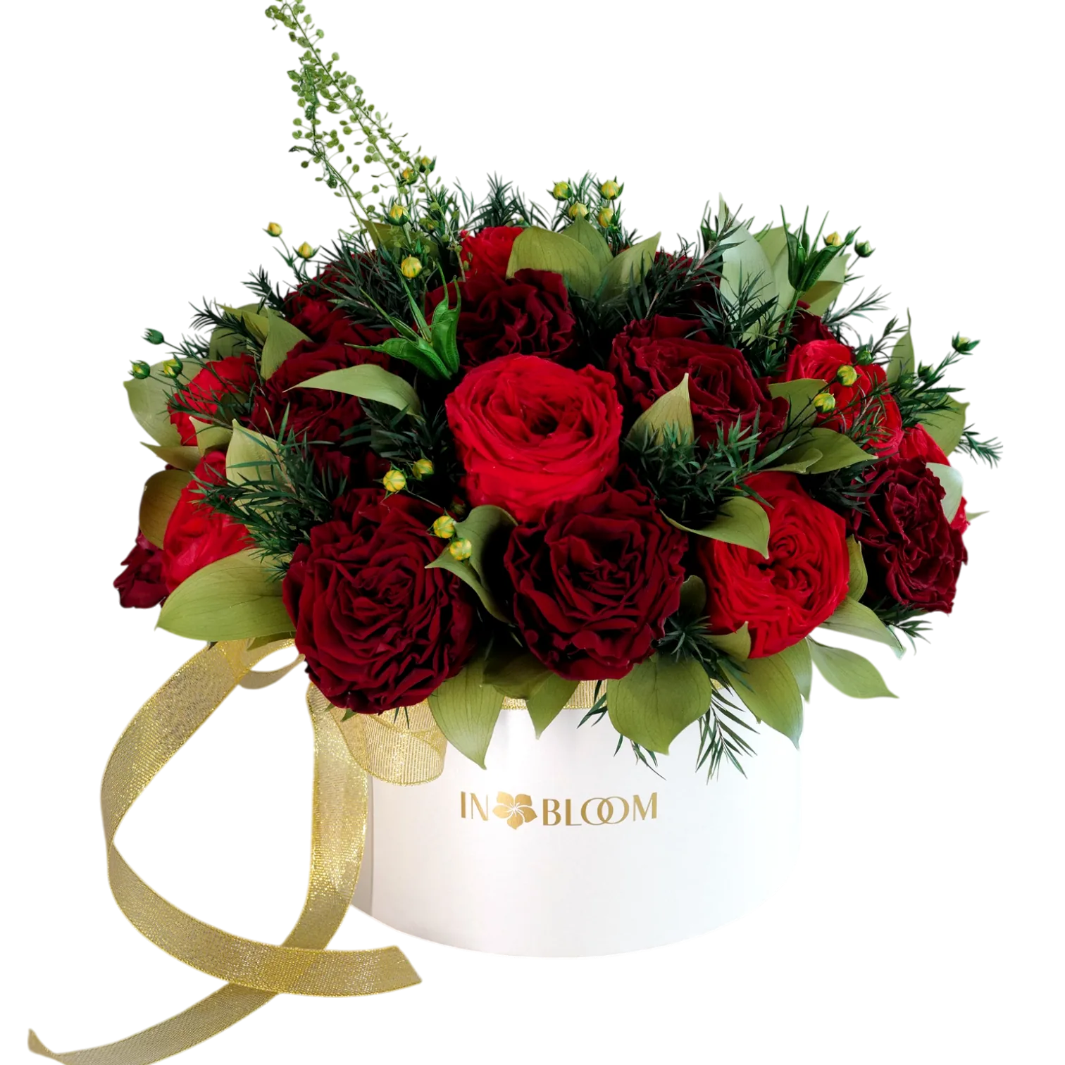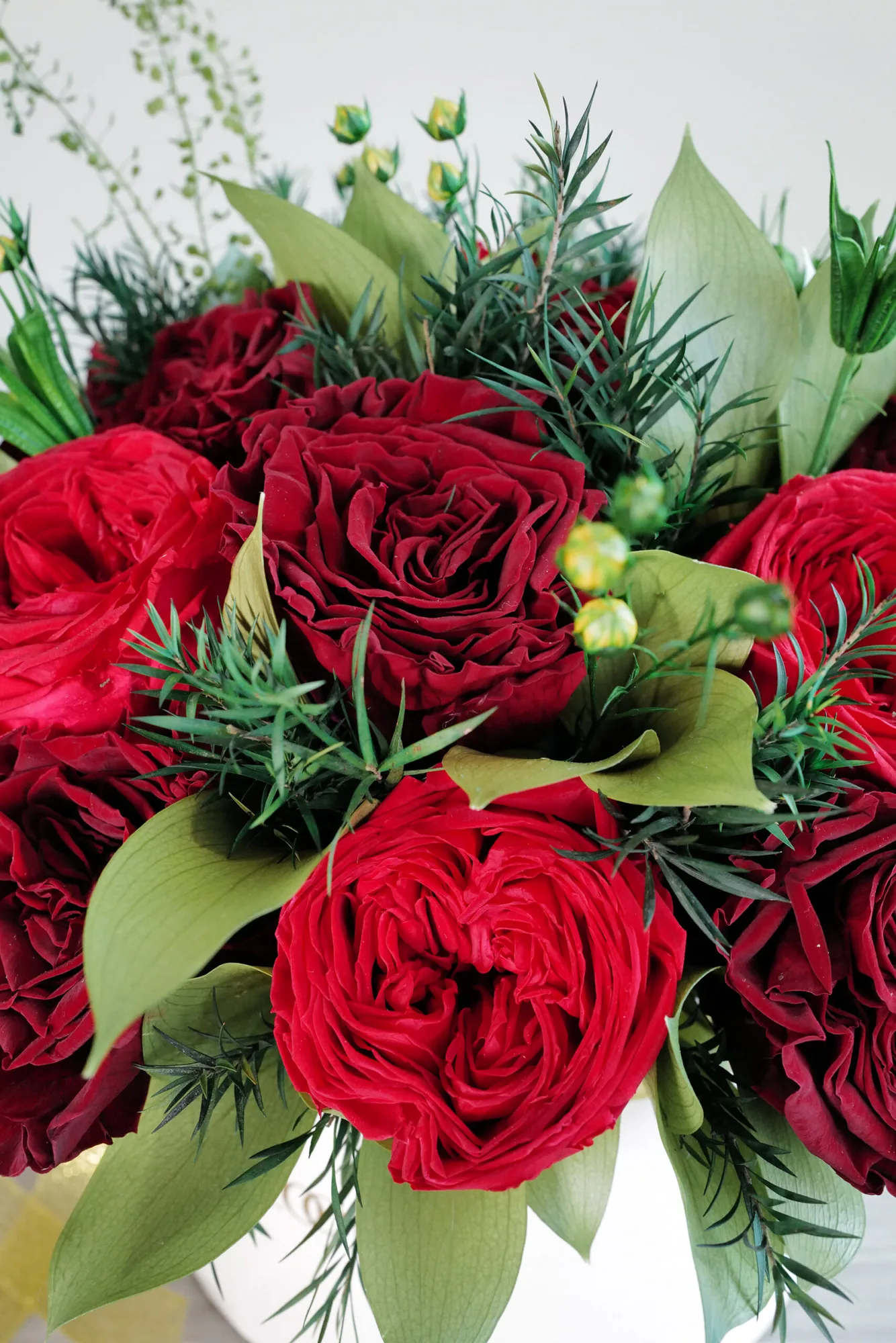 Olivia is big flower box of long-lasting blooms featuring deep red garden and romantic roses with mixed greens and accented with dried flax.