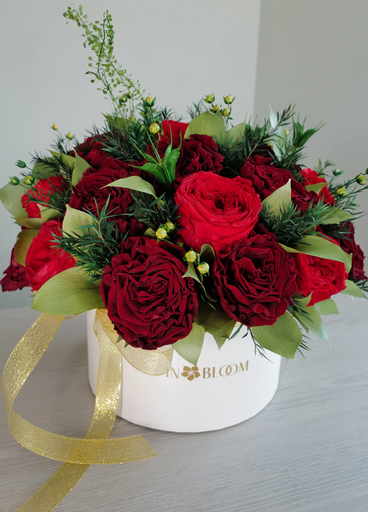 Olivia – Seduction is a dramatic preserved flower box for romantic gestures, anniversaries and premium celebrations in Dubai. The deep red roses and textured greens create a rich display that can remain part of the interior after the occasion. Because the flowers are preserved, the arrangement keeps its beauty for more than a year without watering, vase changes or regular maintenance.