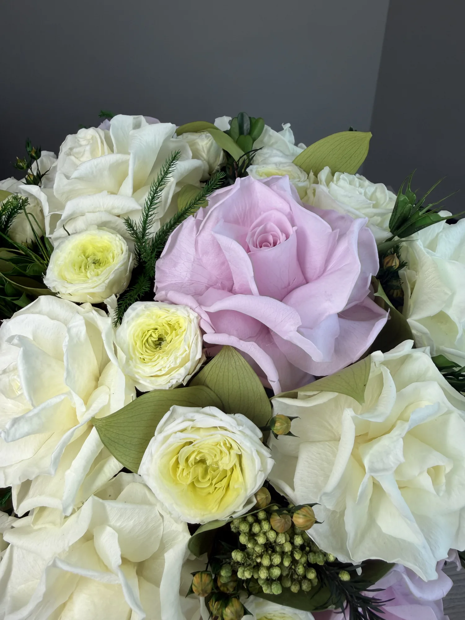 This piece is crafted exclusively from 100% natural flowers that have been bio-preserved to last up to one year without the need for water or maintenance. Please note that each arrangement is uniquely designed by our in-house florists, so natural variations in color, shape, and composition are to be expected.