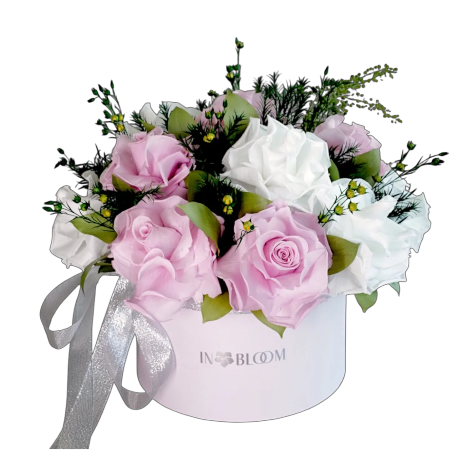 Olivia – Tender Love is a soft preserved flower box for elegant gifting when the mood should feel gentle, warm and refined. The pink and white palette works for birthdays, anniversaries, baby showers, thank-you gifts and decorative home accents. Its preserved flowers stay beautiful for more than a year in Dubai, giving the recipient a lasting floral piece without water or daily care.