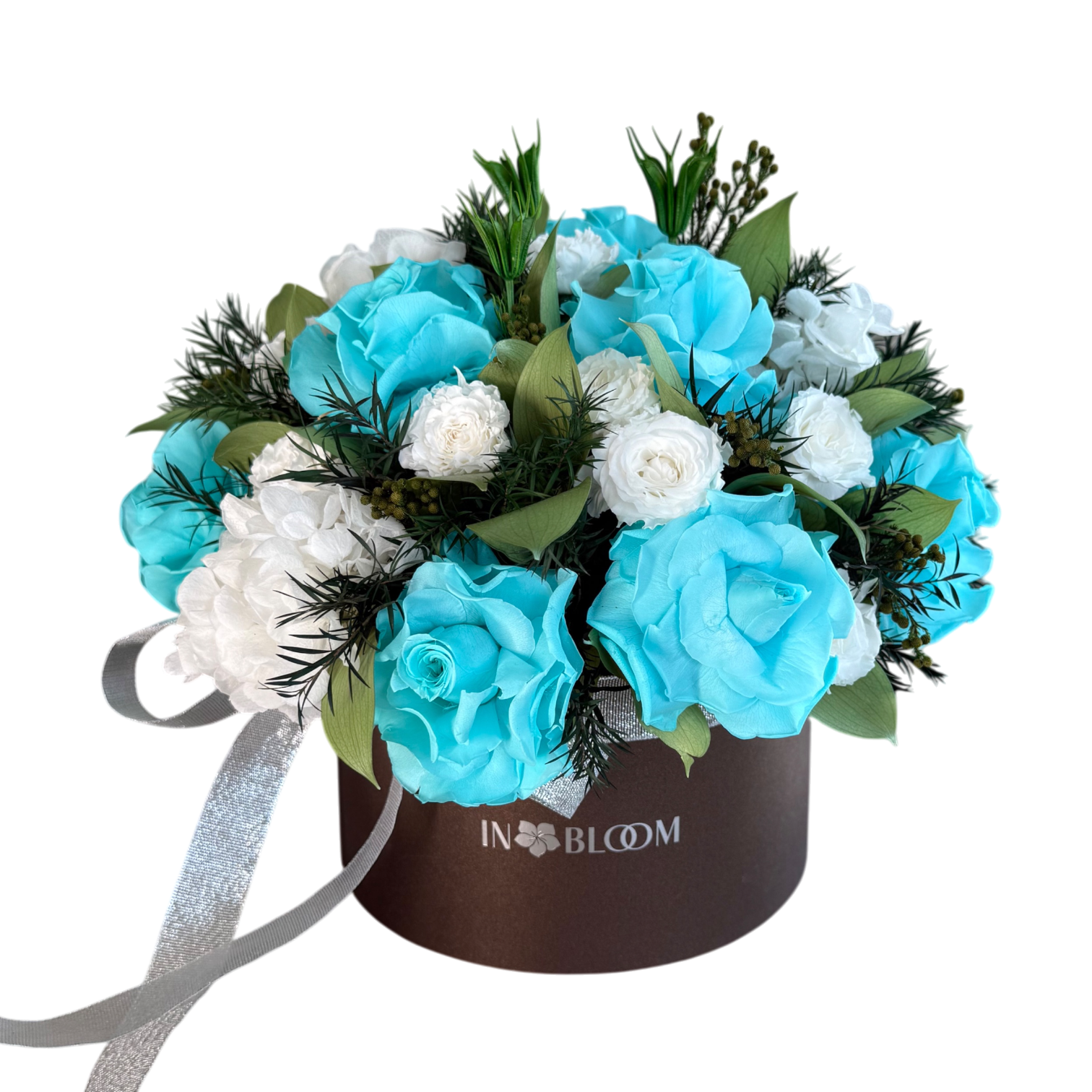 Olivia is big flower box of long-lasting blooms featuring delicate Tiffany blue & white French roses with green orange leaves and accented with dried flax.