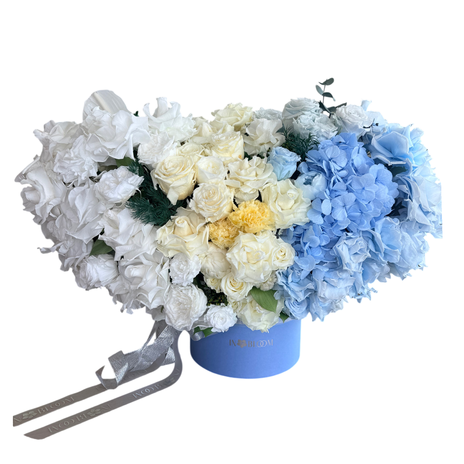 A giant heart-shaped preserved flower arrangement in a premium pearlescent blue box, featuring a delicate mix of romantic and garden roses with fresh green accents. This stunning composition brings elegance and harmony to any space — a luxurious gift with a guaranteed wow-effect.