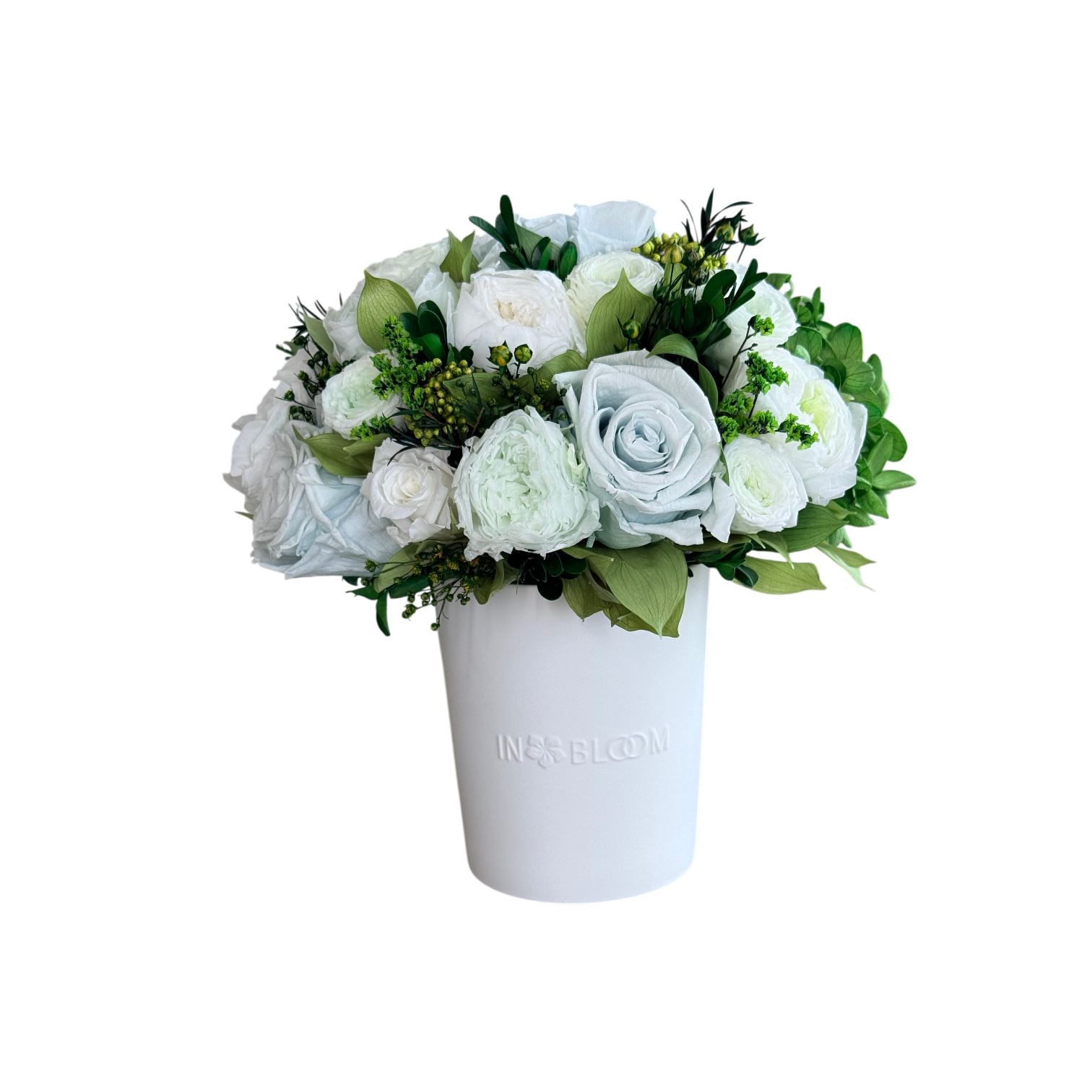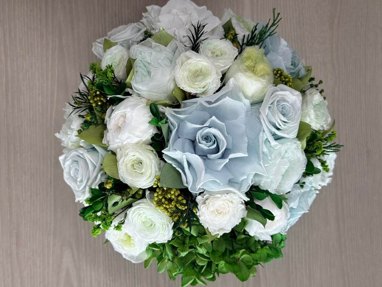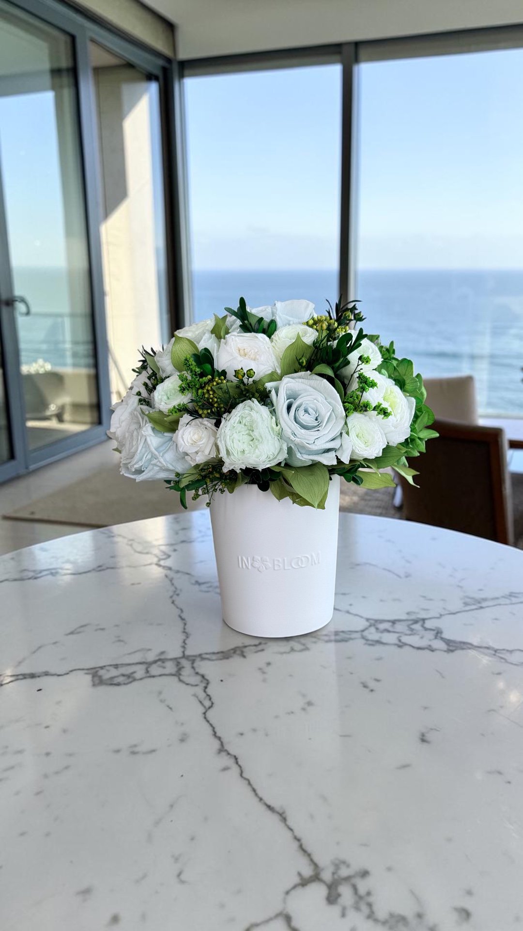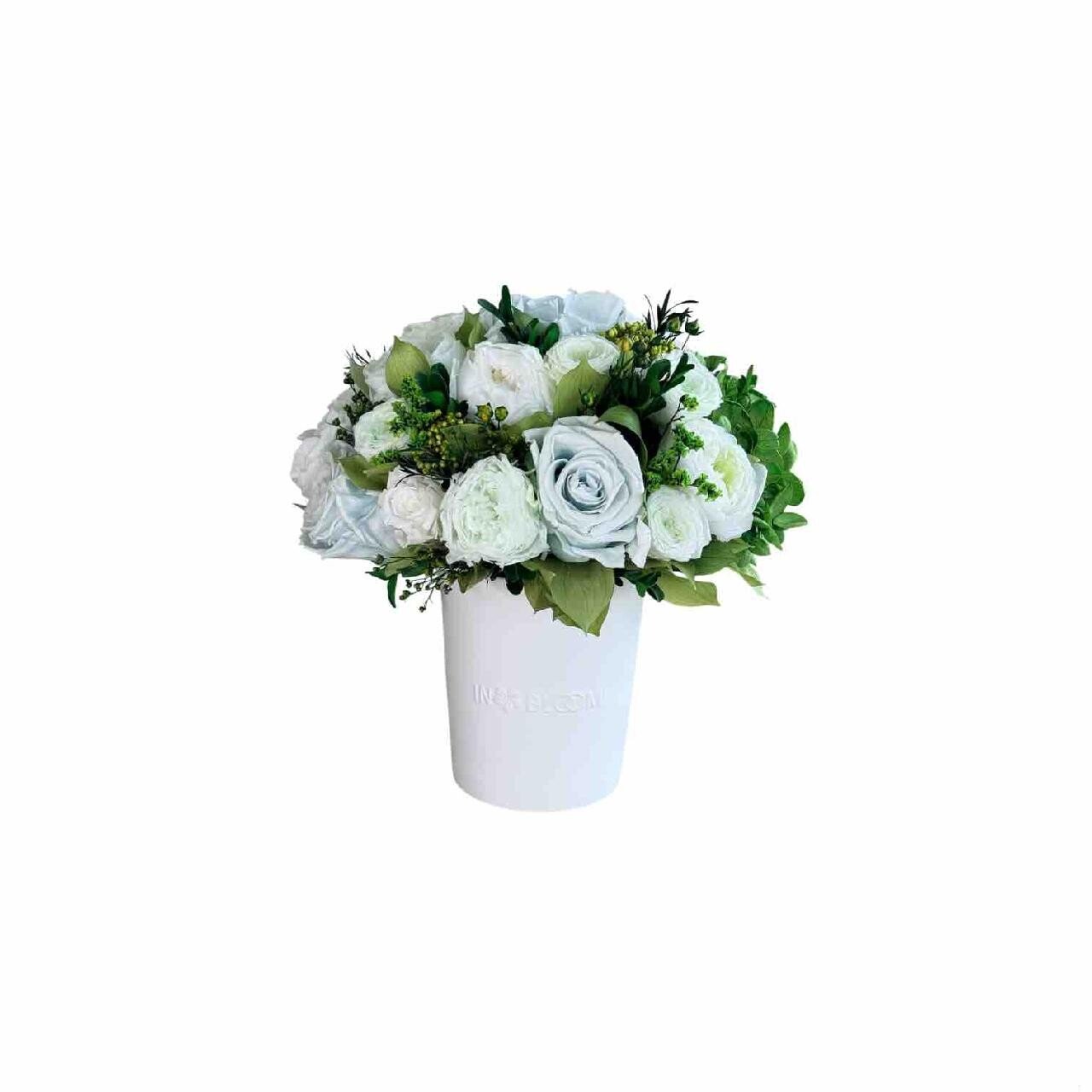 This piece is crafted exclusively from 100% natural flowers that have been bio-preserved to last up to one year without the need for water or maintenance. Please note that each arrangement is uniquely designed by our in-house florists, so natural variations in color, shape, and composition are to be expected.