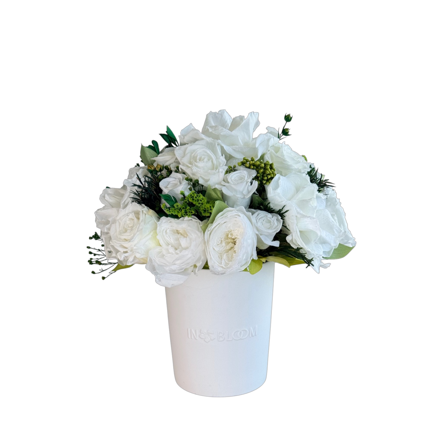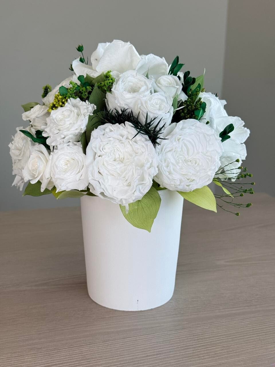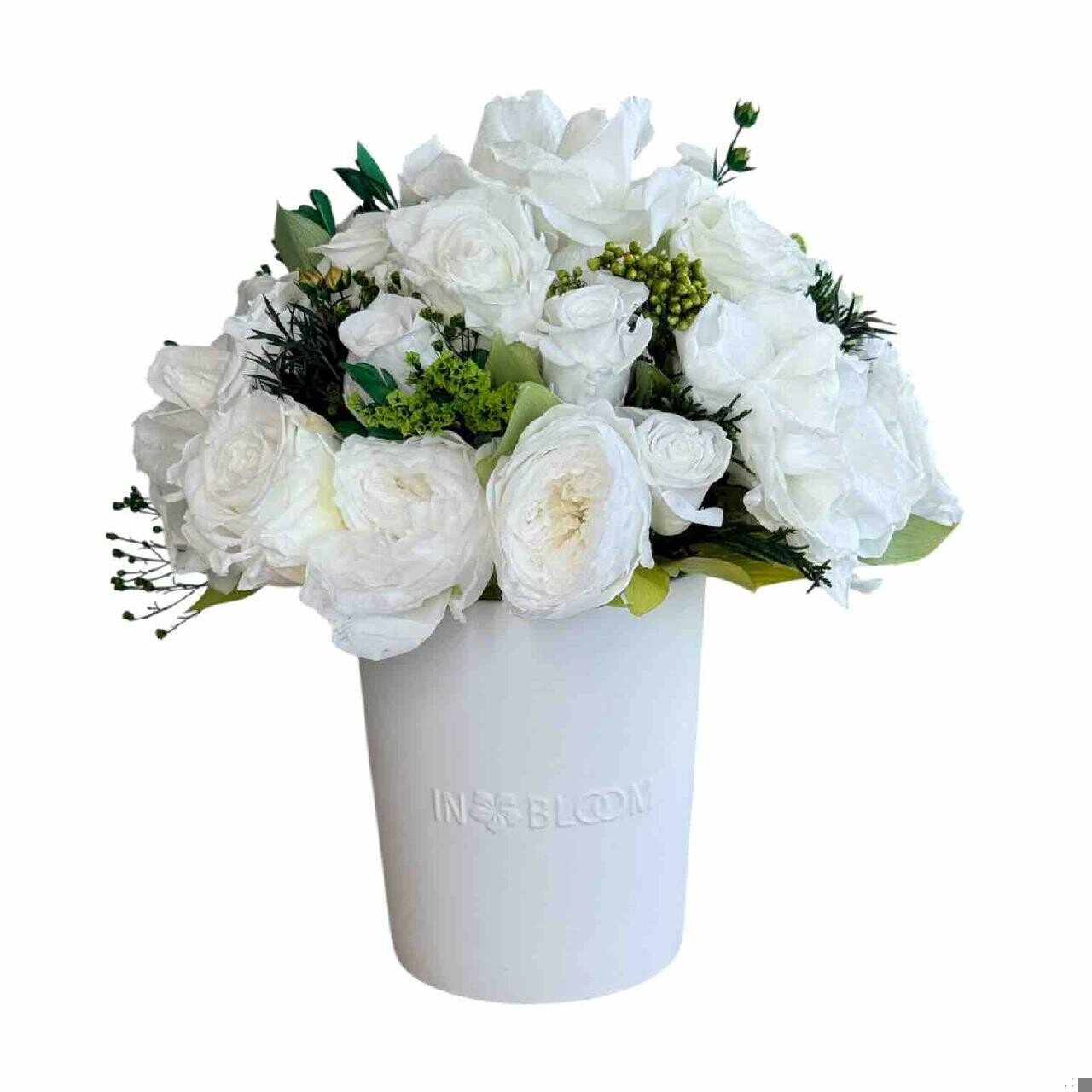 This piece is crafted exclusively from 100% natural flowers that have been bio-preserved to last up to one year without the need for water or maintenance. Please note that each arrangement is uniquely designed by our in-house florists, so natural variations in color, shape, and composition are to be expected.
