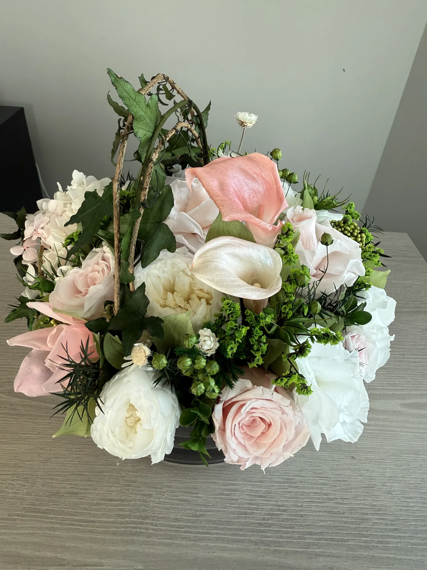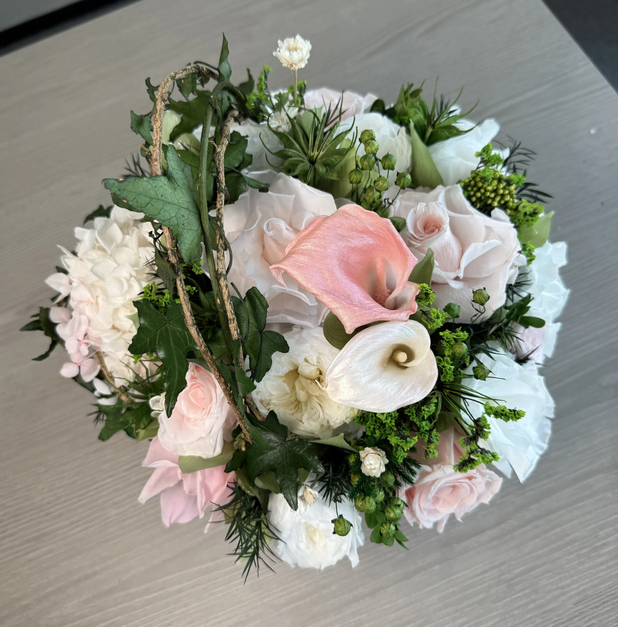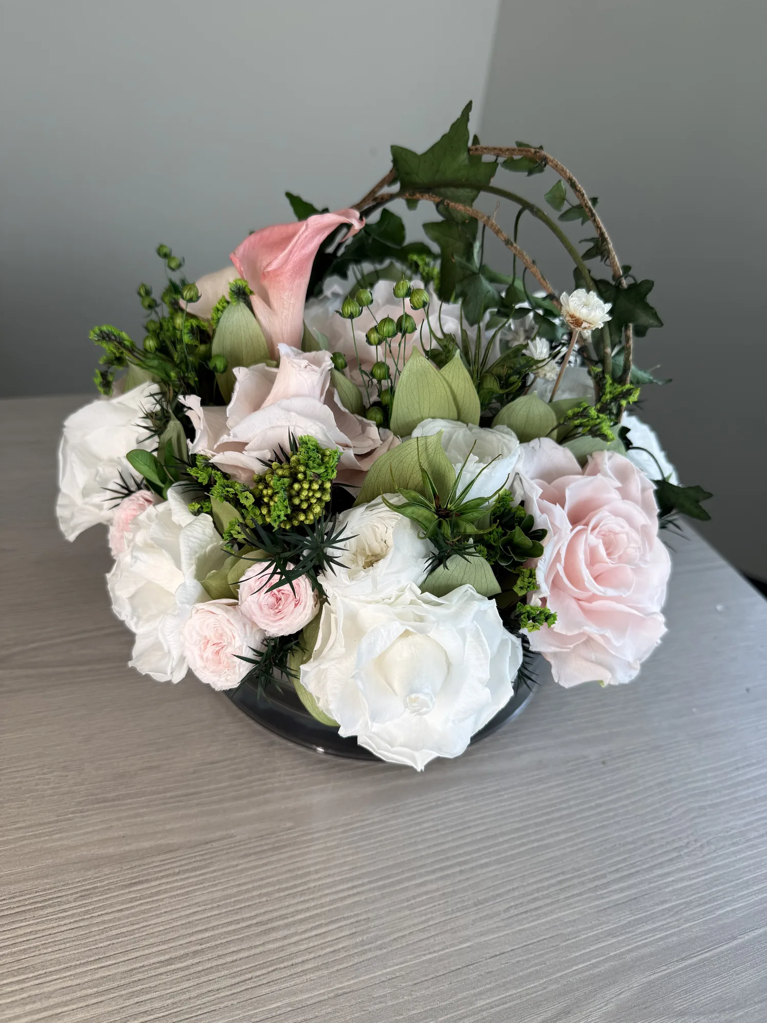Grace is a delicate celebration of floral artistry, blending soft romance with timeless elegance. Featuring bio-preserved premium roses, lush calls, peonies, and garden roses, this arrangement is complemented by airy gypsophila, italian ruscus and garden ruscus for a naturally flowing composition.