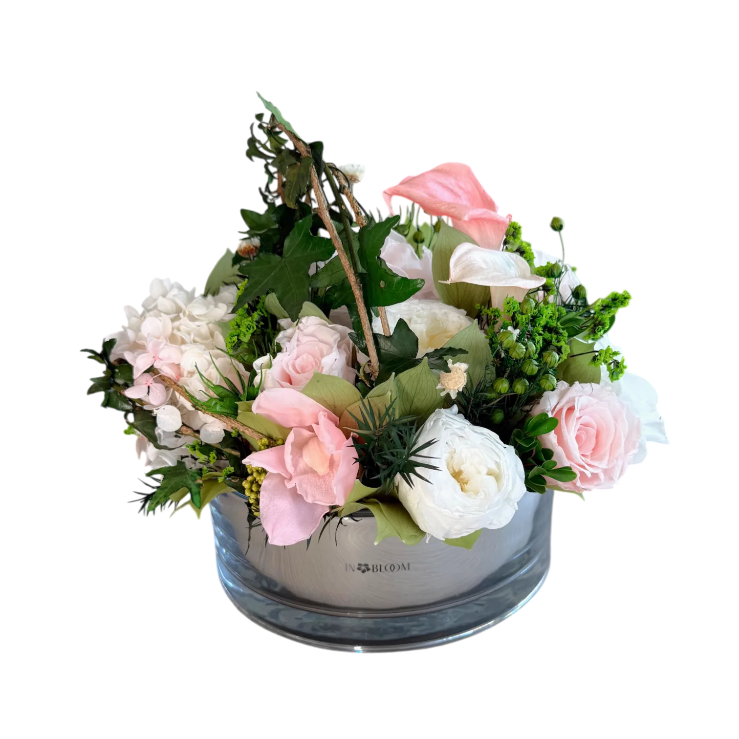 This piece is crafted exclusively from 100% natural flowers that have been bio-preserved to last up to one year without the need for water or maintenance. Please note that each arrangement is uniquely designed by our in-house florists, so natural variations in color, shape, and composition are to be expected.