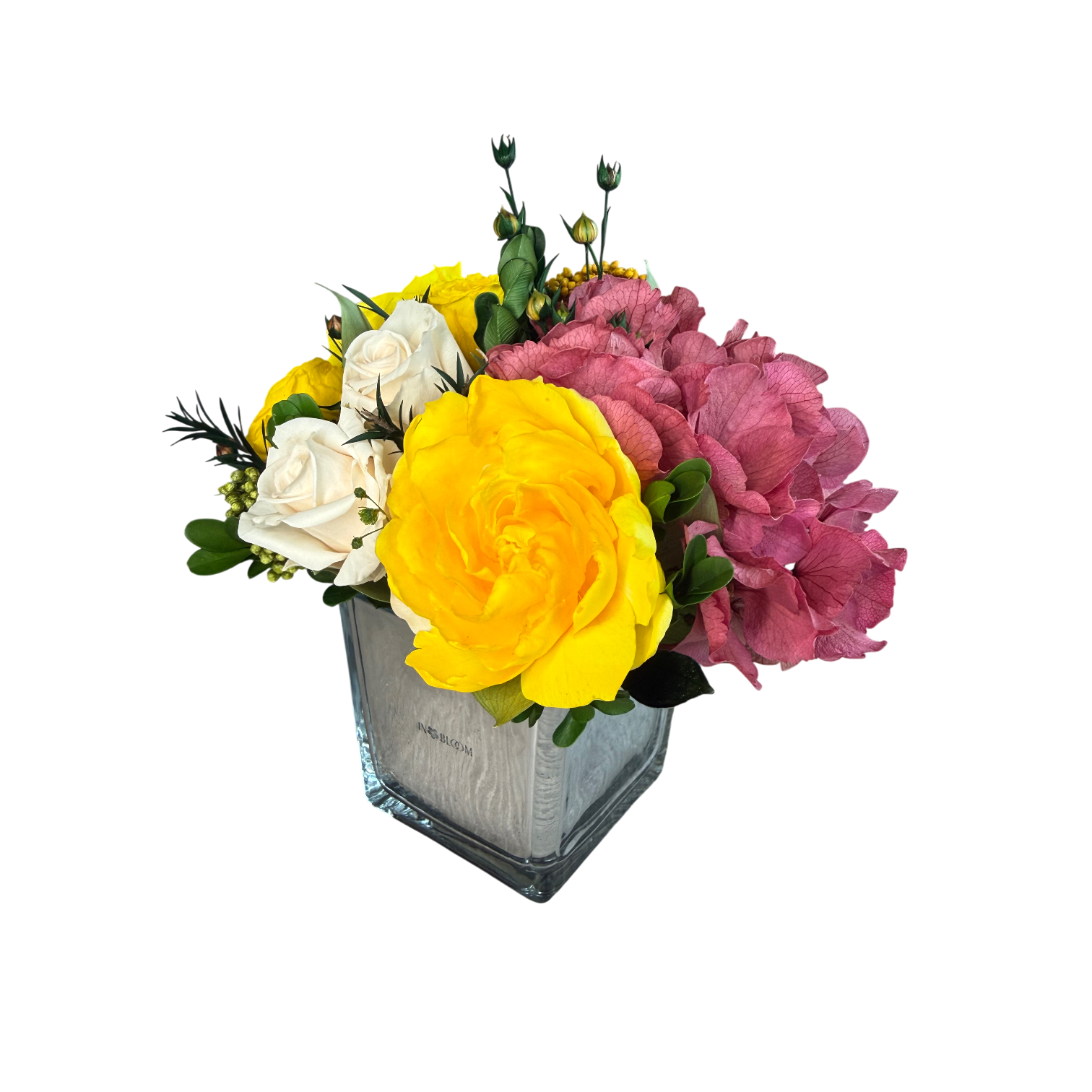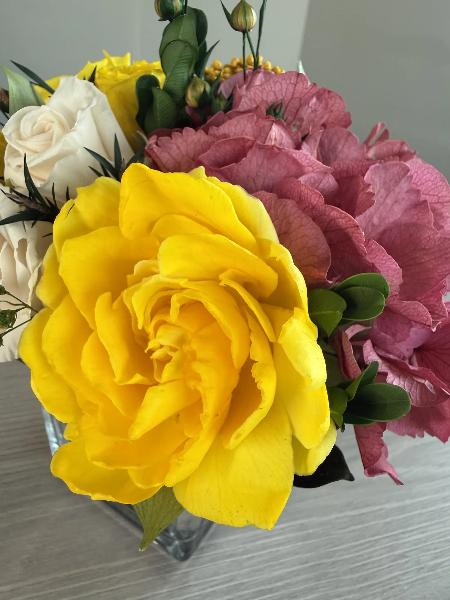 Amely is a small mirror vase arrangement featuring yellow gardenia, small roses and hydrangeas with mix green. A delicate floral masterpiece for any interior.
