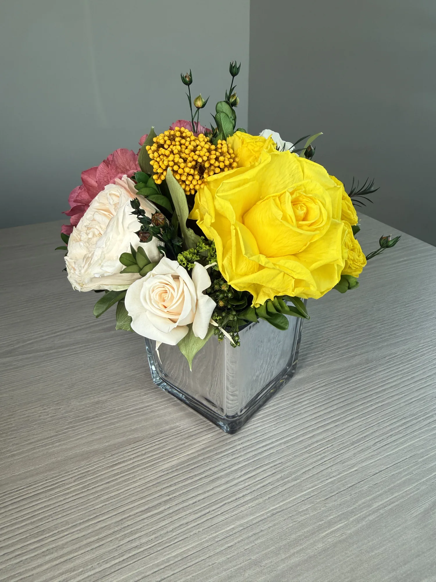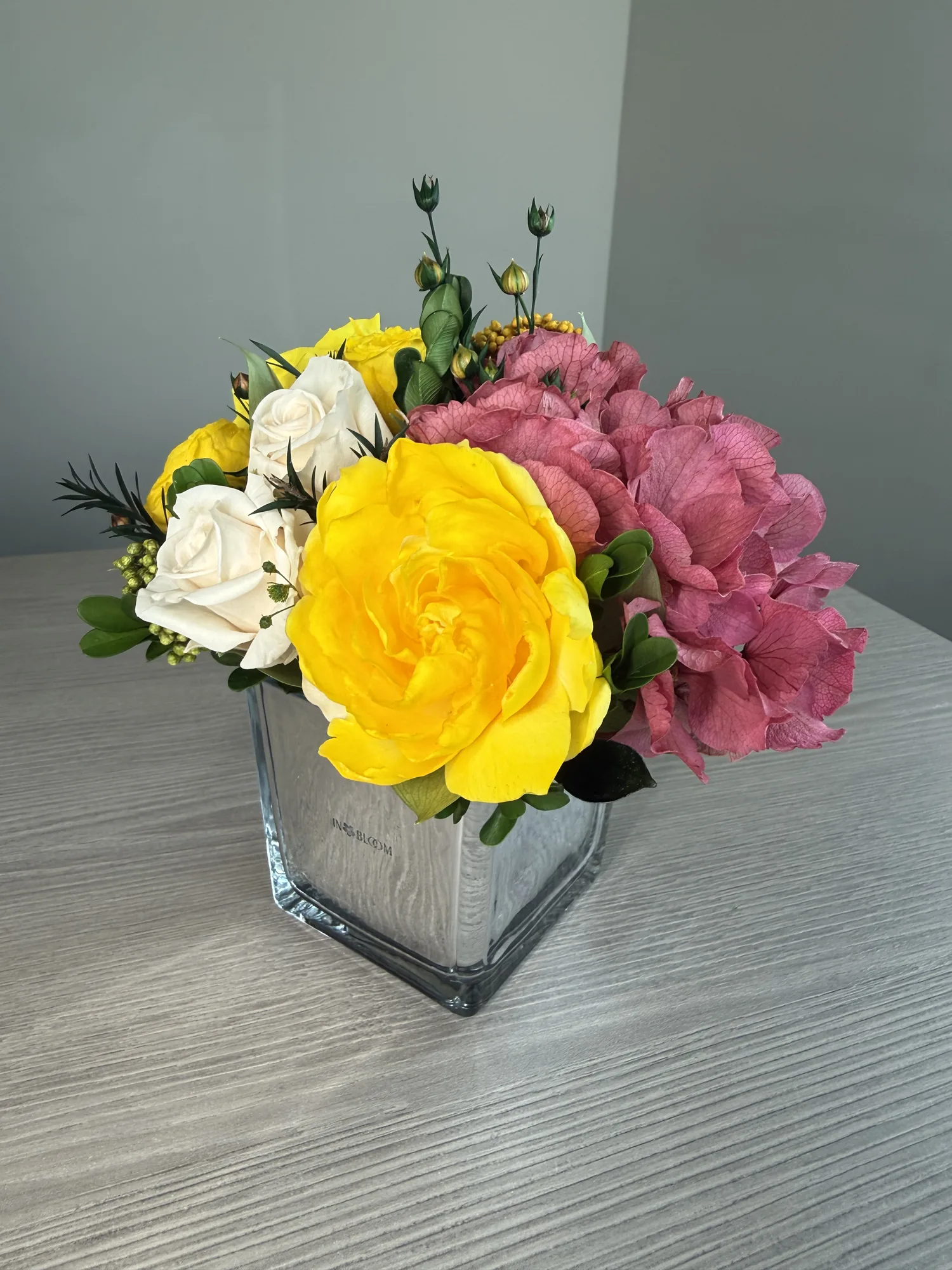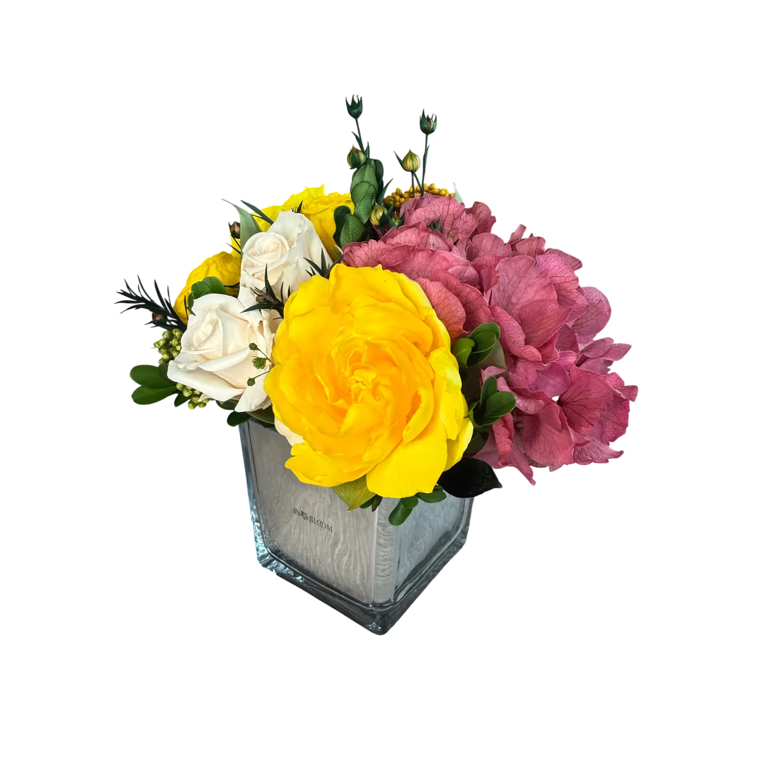 This piece is crafted exclusively from 100% natural flowers that have been bio-preserved to last up to one year without the need for water or maintenance. Please note that each arrangement is uniquely designed by our in-house florists, so natural variations in color, shape, and composition are to be expected.