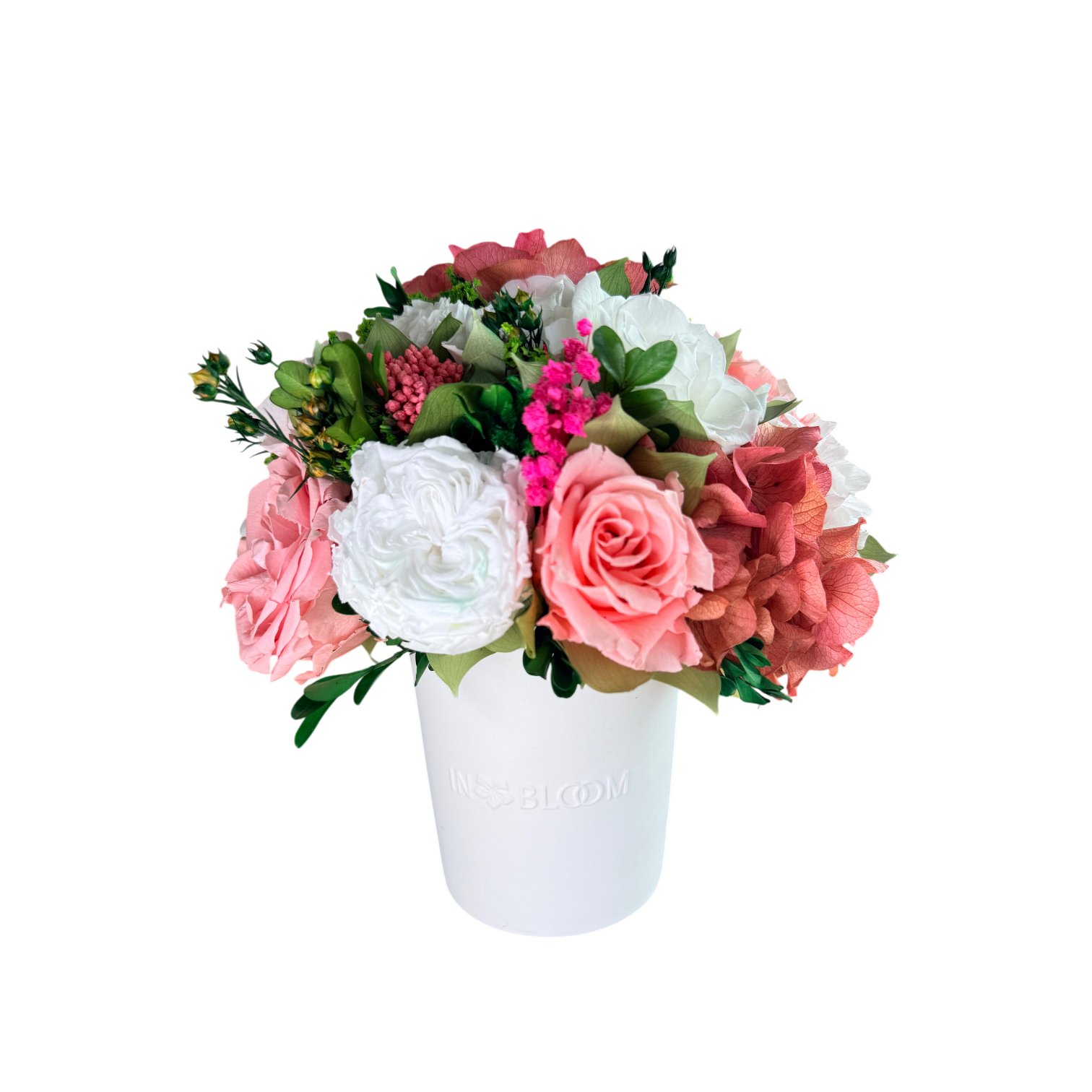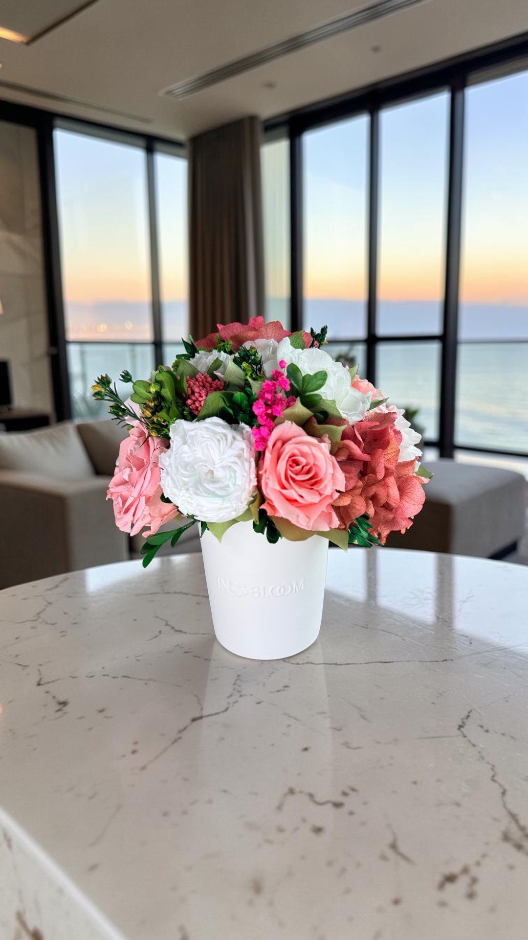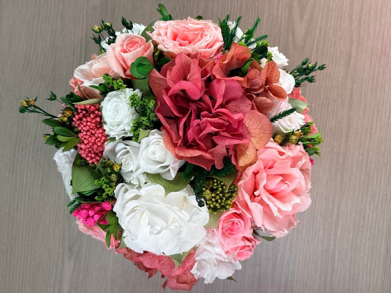 This piece is crafted exclusively from 100% natural flowers that have been bio-preserved to last up to one year without the need for water or maintenance. Please note that each arrangement is uniquely designed by our in-house florists, so natural variations in color, shape, and composition are to be expected.