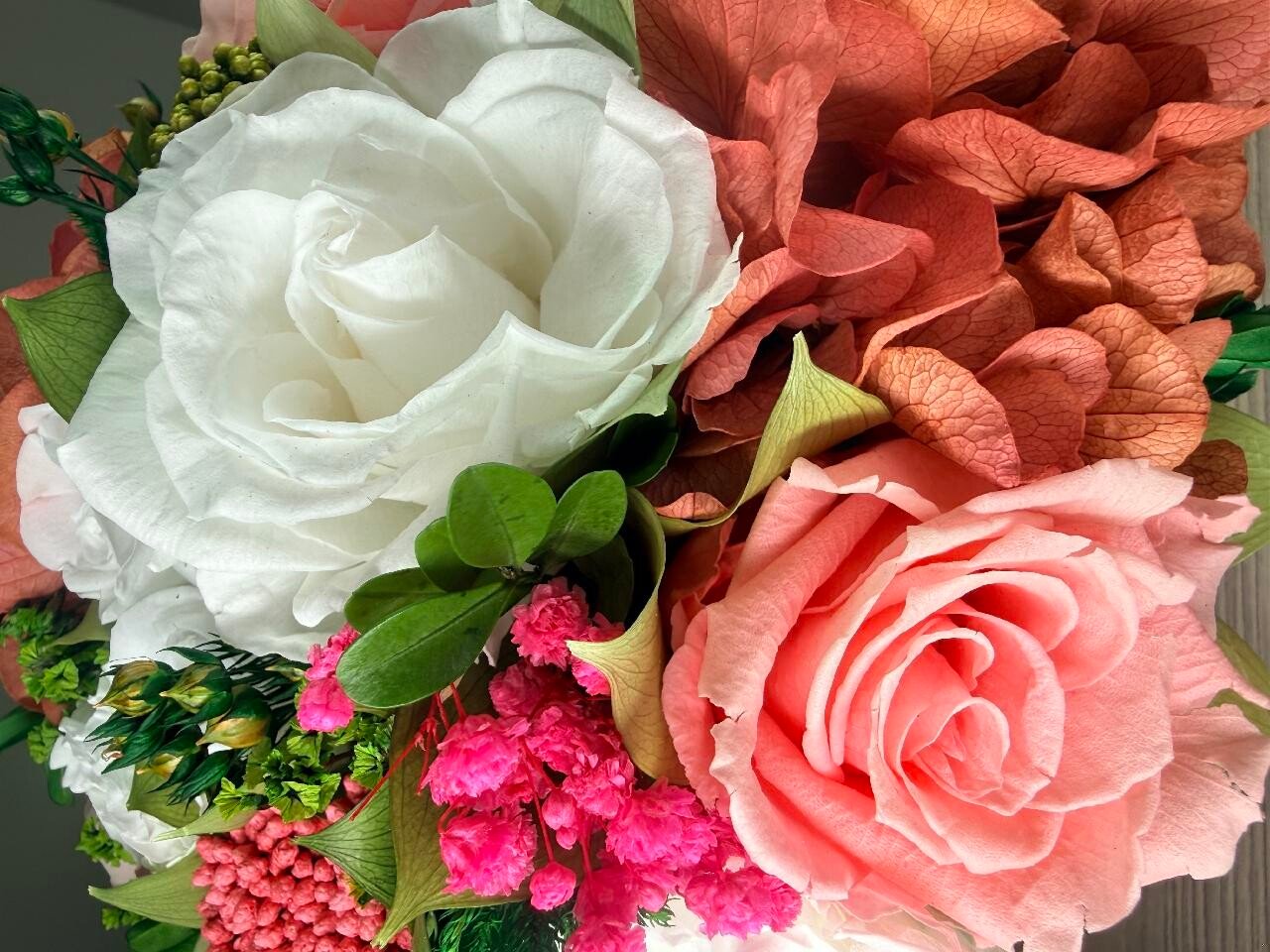 | Flower TypeExplore Our Premium Floral Selection The Flower Type attribute allows you to browse our exquisite collection based on the specific flowers used in each arrangement. From timeless roses and elegant orchids to lush peonies and vibrant dahlias, our curated selection ensures you find the perfect blooms for any occasion. Each flower type is carefully chosen for its beauty, longevity, and sophistication, offering both fresh and bio-preserved options. Whether you\'re looking for classic bouquets, statement floral pieces, or sustainable arrangements, our diverse range of flowers guarantees elegance that lasts. Find the perfect floral arrangement tailored to your taste and style. | Hydrangeas, Roses |