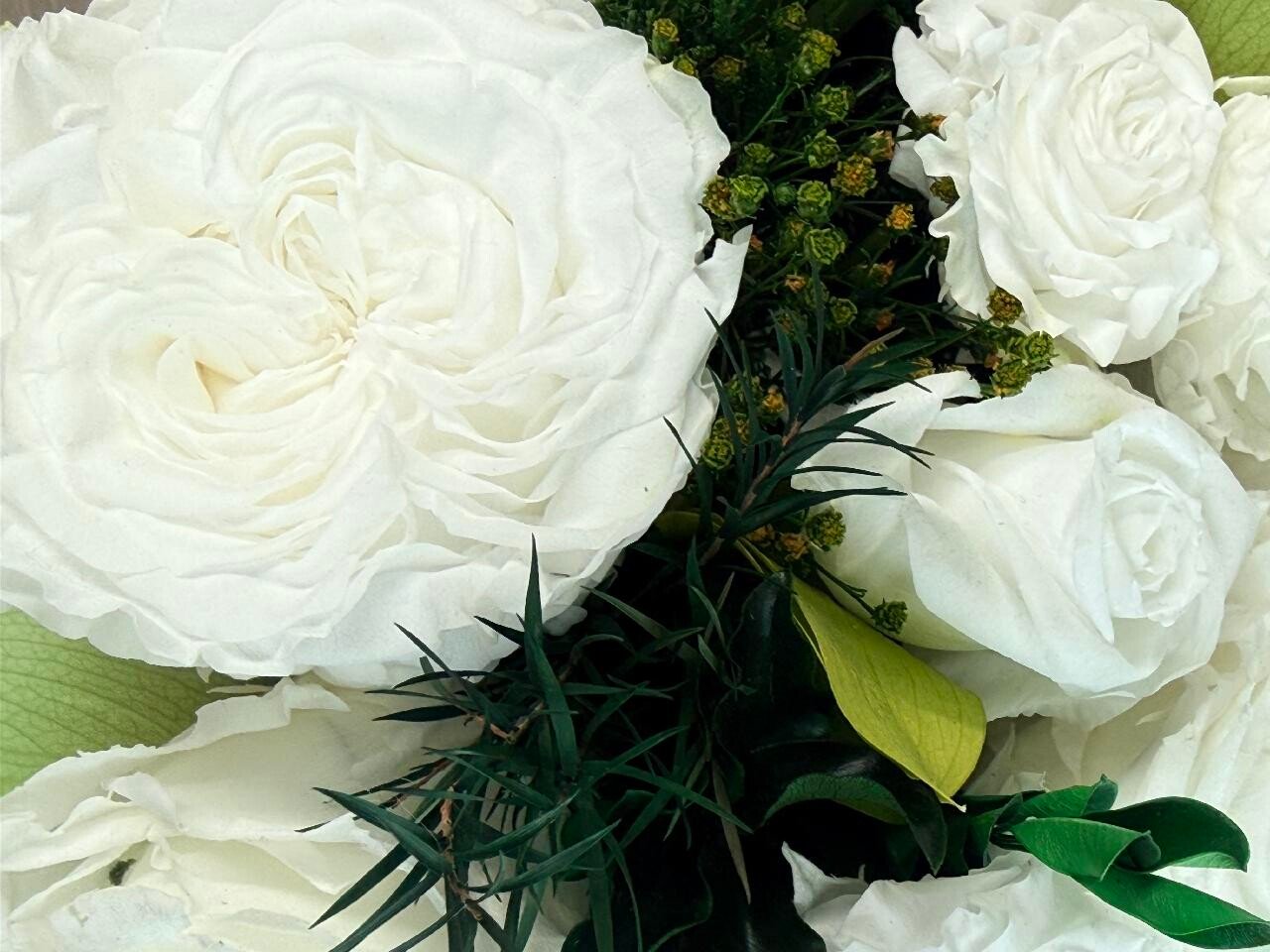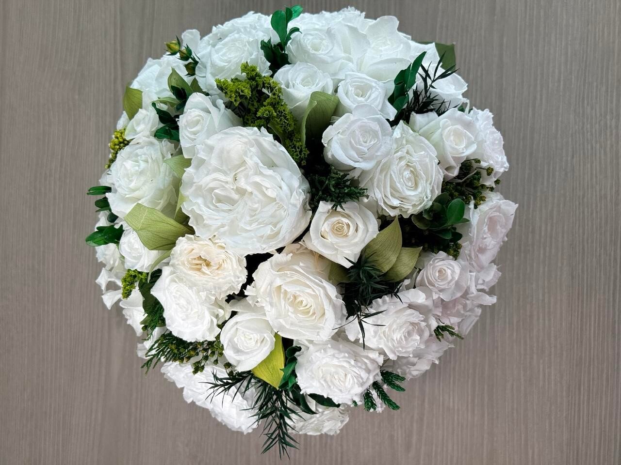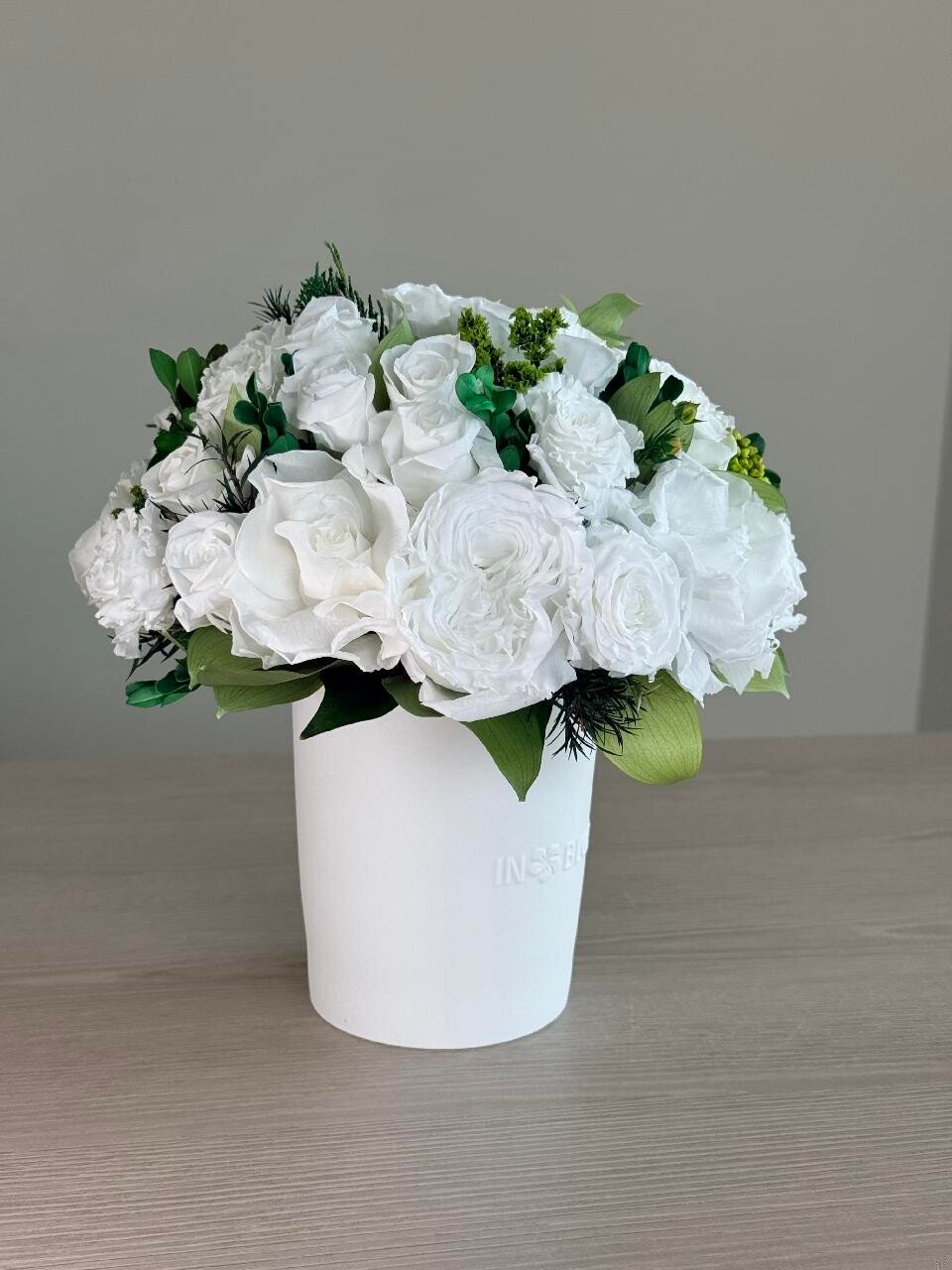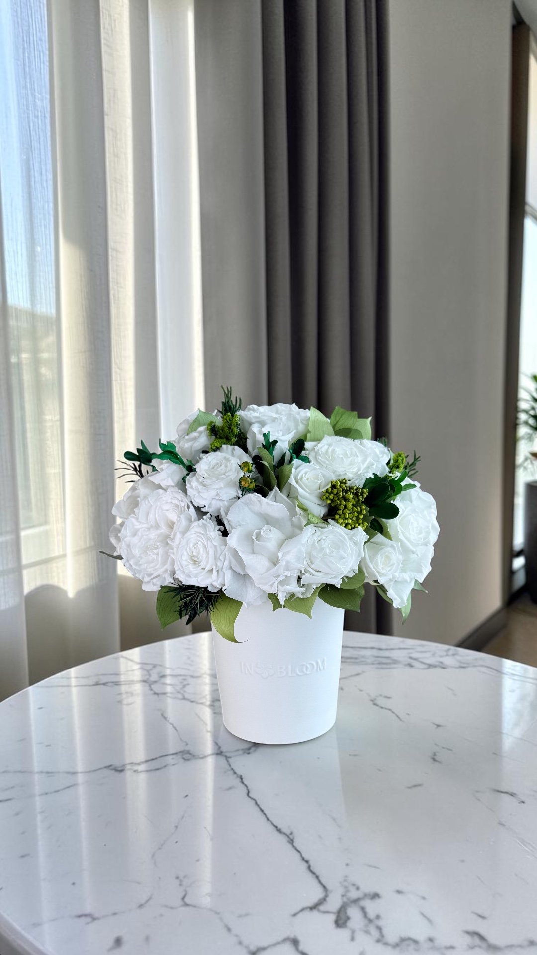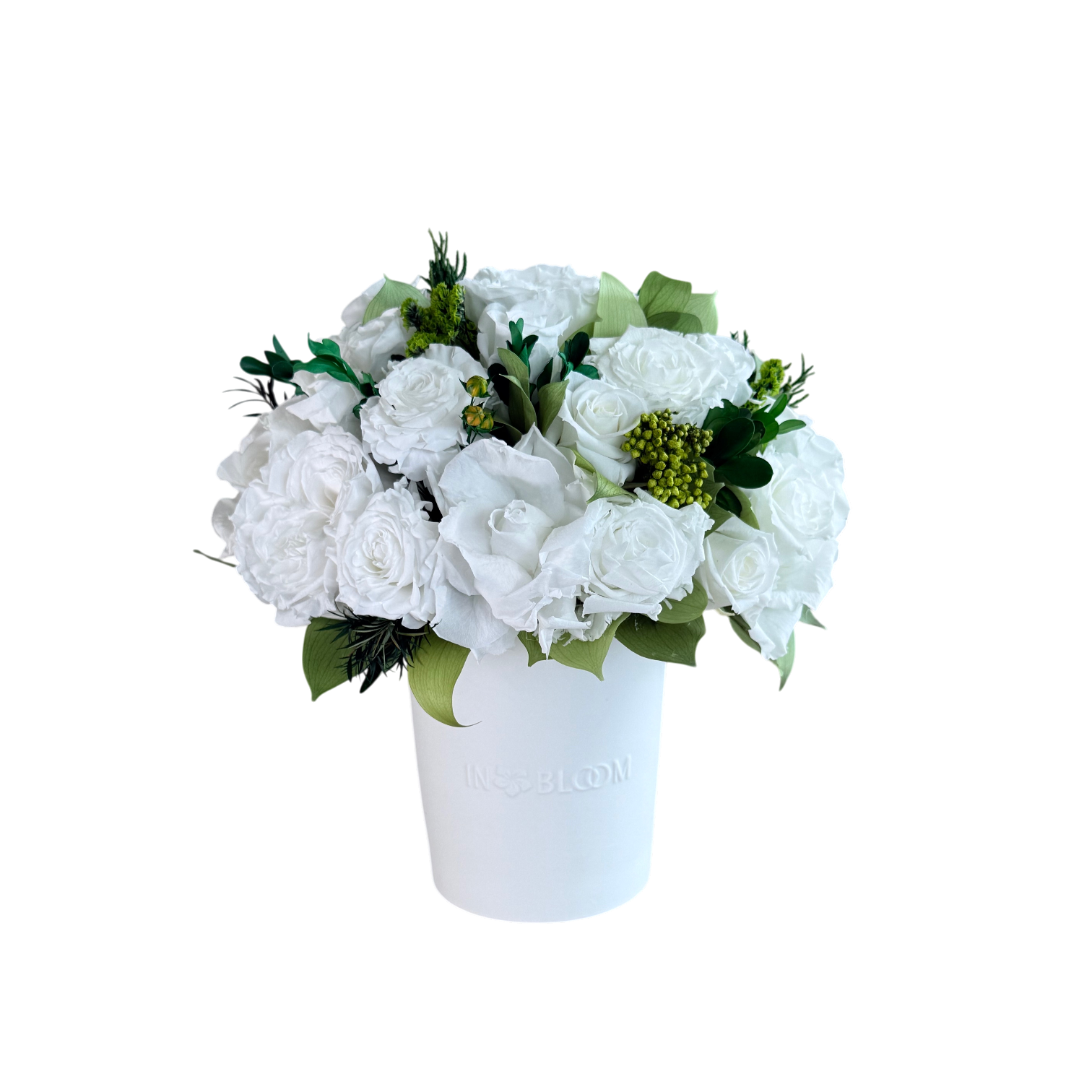 Luna is a poetic expression of natural beauty, evoking the softness of a gentle breeze through a blooming garden. This exquisite arrangement features bio-preserved white Classic & Garden roses, Hydrangeas and greens.