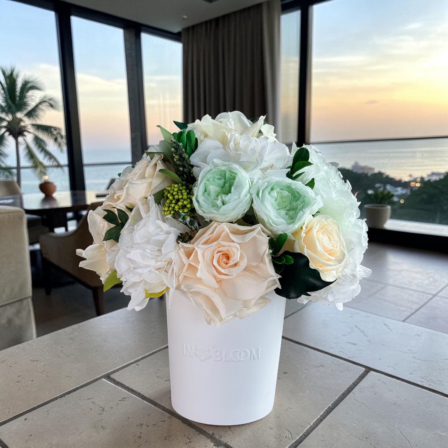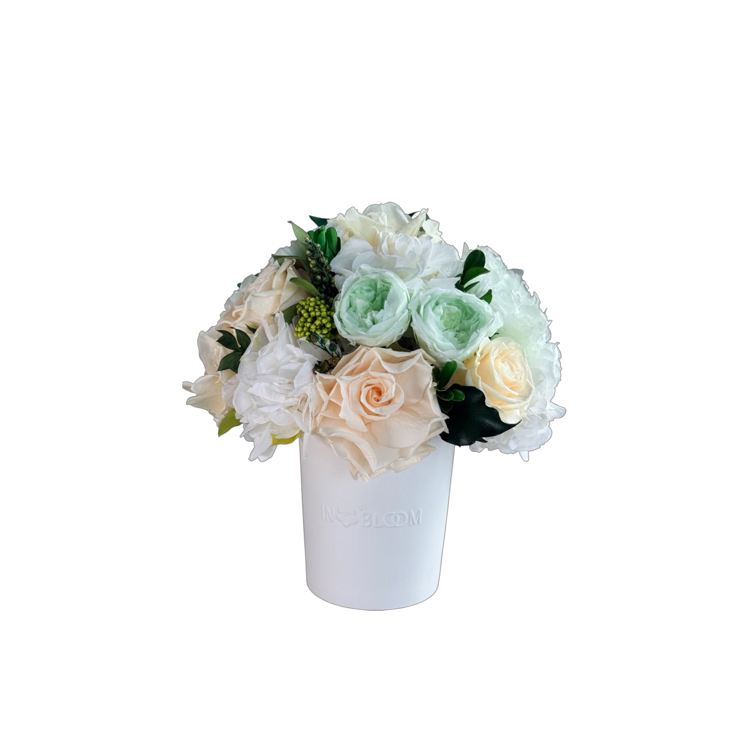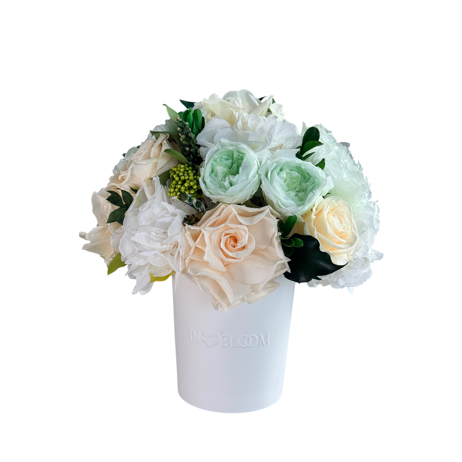 This piece is crafted exclusively from 100% natural flowers that have been bio-preserved to last up to one year without the need for water or maintenance. Please note that each arrangement is uniquely designed by our in-house florists, so natural variations in color, shape, and composition are to be expected.