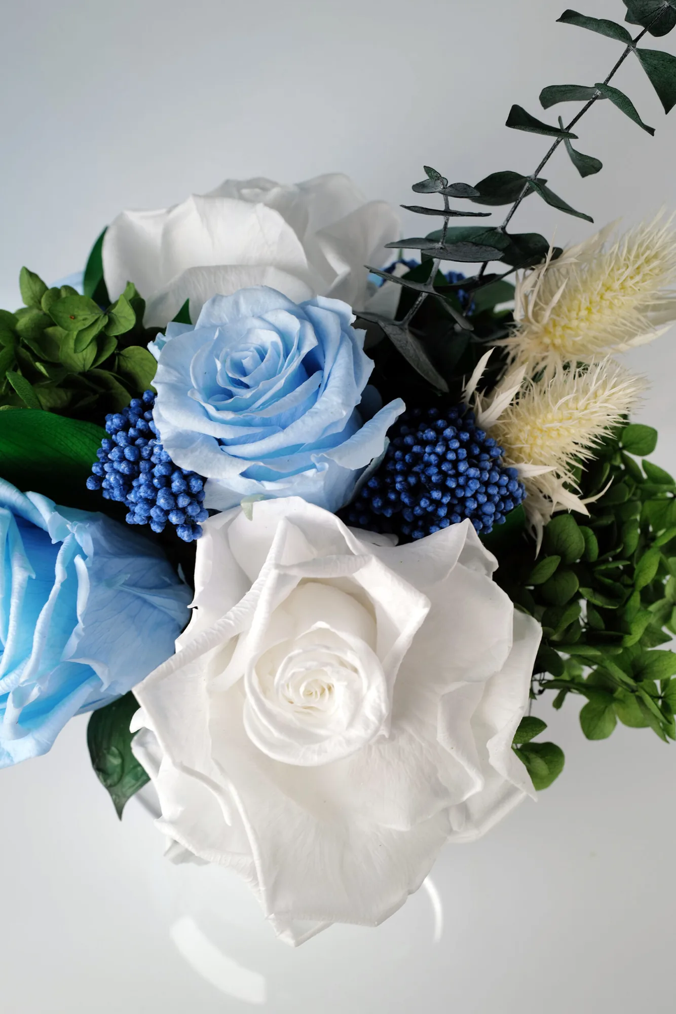 Loulou S Cloud – a refined mix of soft blue and white roses with greenery, arranged in a mirrored vase. Compact, elegant, and long-lasting — ideal for interiors or gifting.
