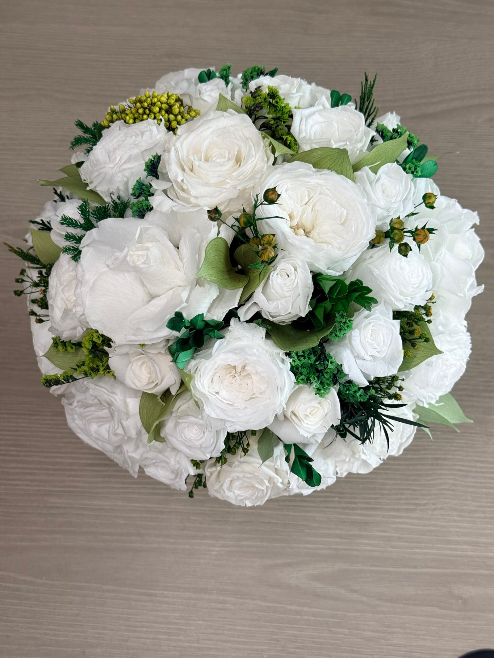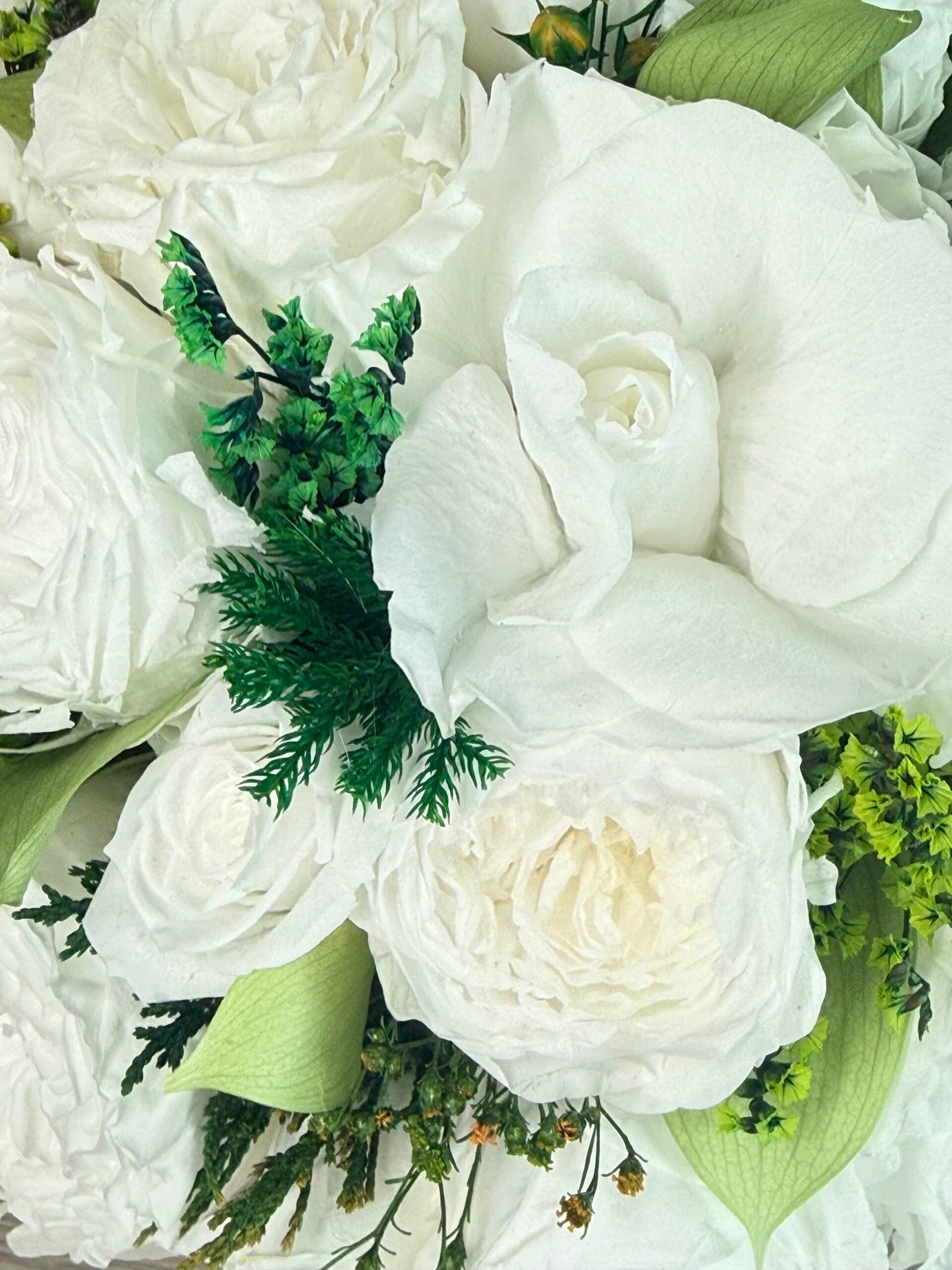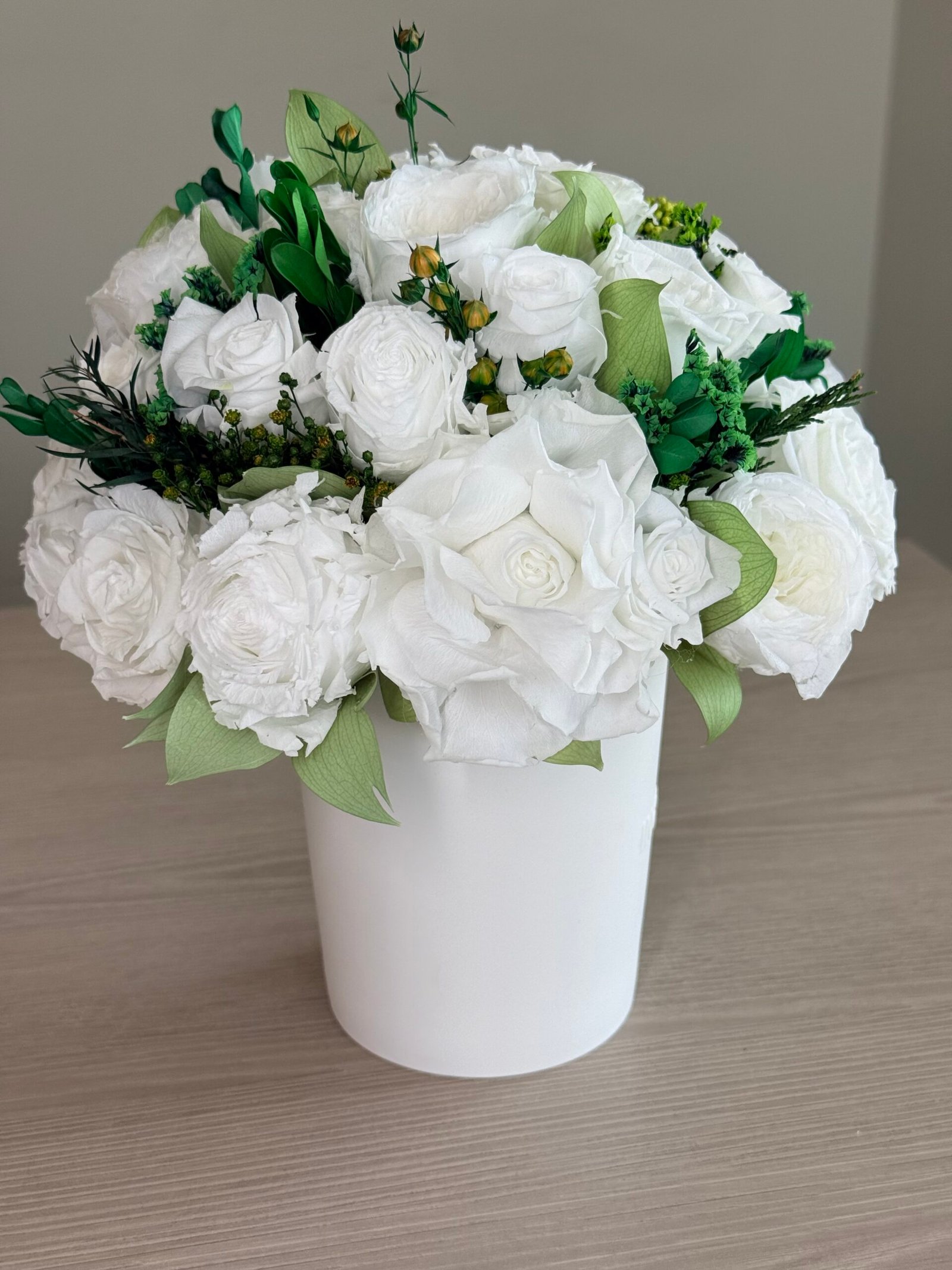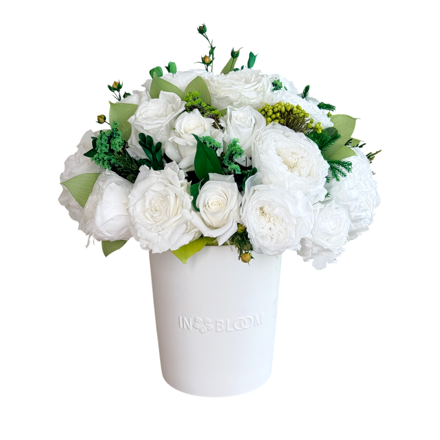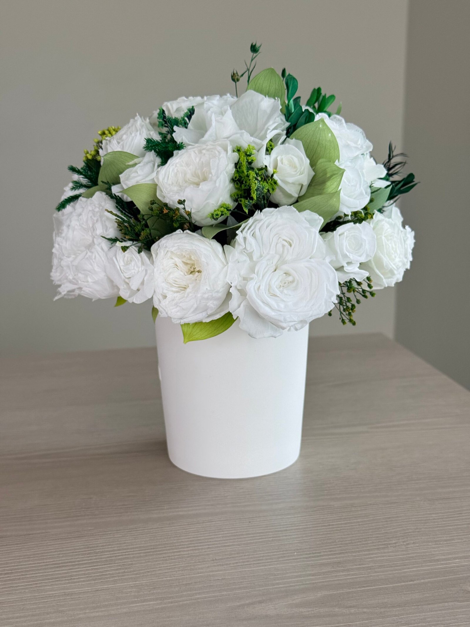 Luna is a poetic expression of natural beauty, evoking the softness of a gentle breeze through a blooming garden. This exquisite arrangement features bio-preserved white Classic & Garden roses, Hydrangeas and greens.