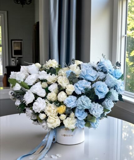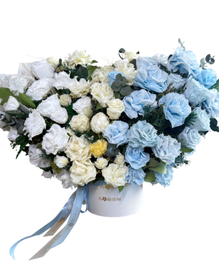 Elis, the petite flower box, is a whimsical arrangement featuring a delightful mix of Royal Blue French roses and white