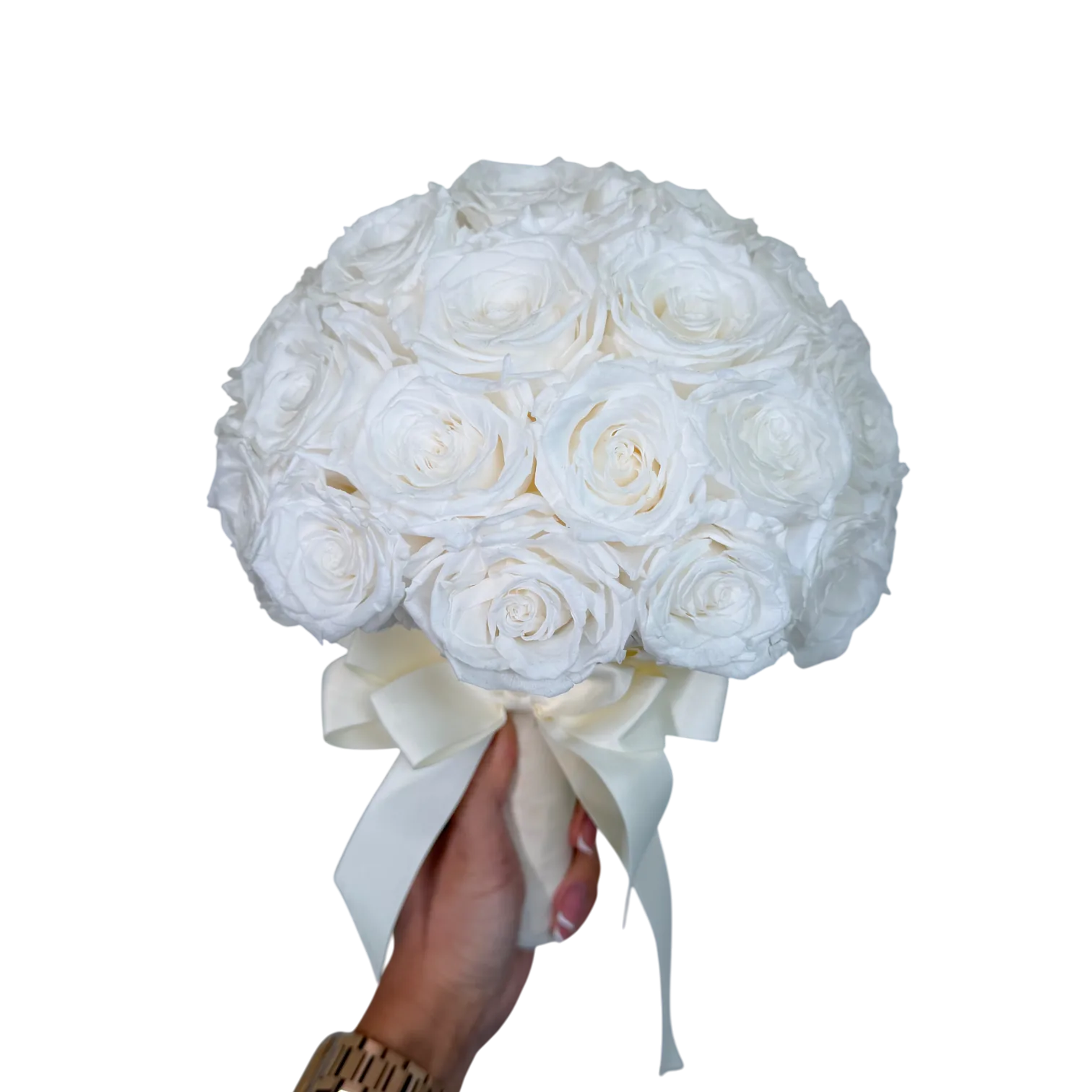 Pure Promise – is a timeless bridal bouquet crafted from classic, preserved ivory roses—chosen for their soft glow and enduring beauty. Each rose is delicately treated to maintain its natural elegance, symbolizing everlasting love and quiet sophistication. With its refined palette and graceful form, this bouquet complements both traditional and modern gowns, offering a sense of calm romance that will remain flawless from the walk down the aisle to cherished years ahead.